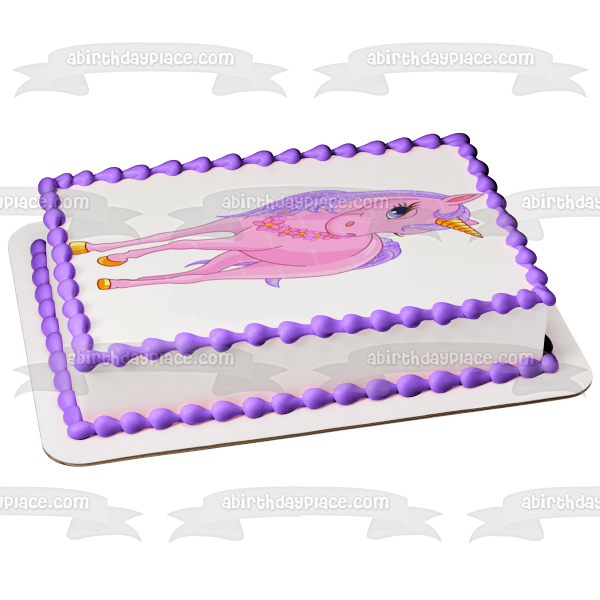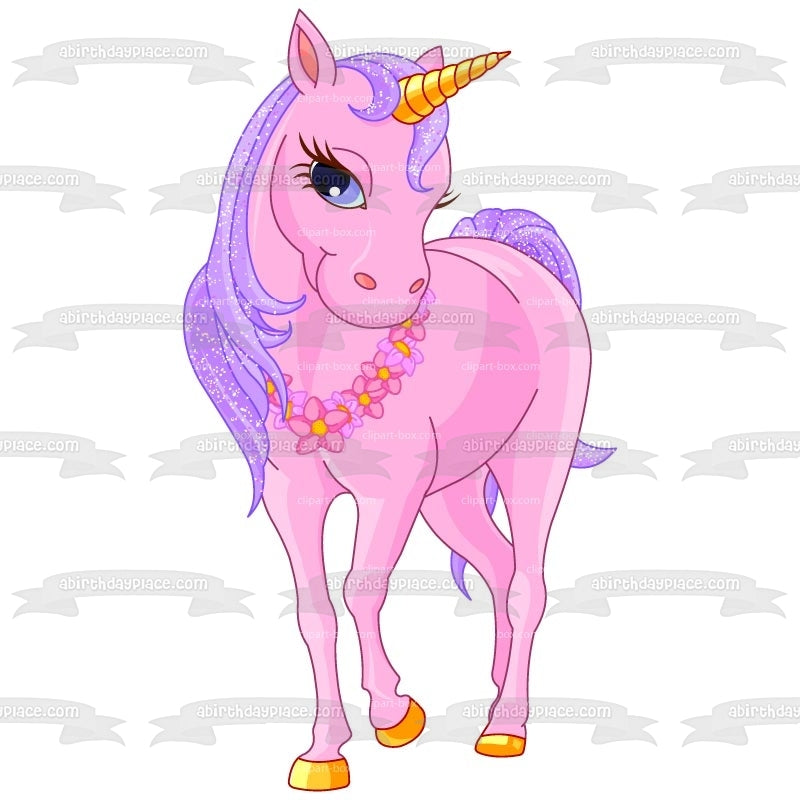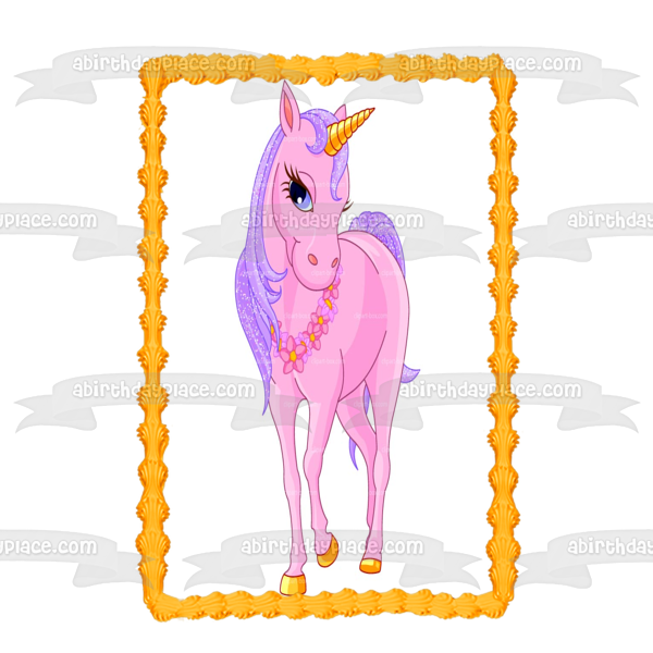Celebrate your special day with this Pink Unicorn themed Edible Cake Topper Image featuring her Gold Horn and wearing a Flower Necklace!