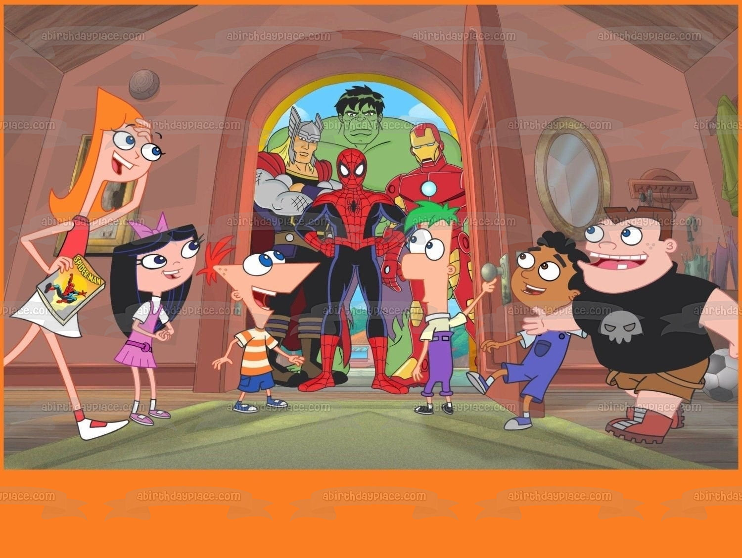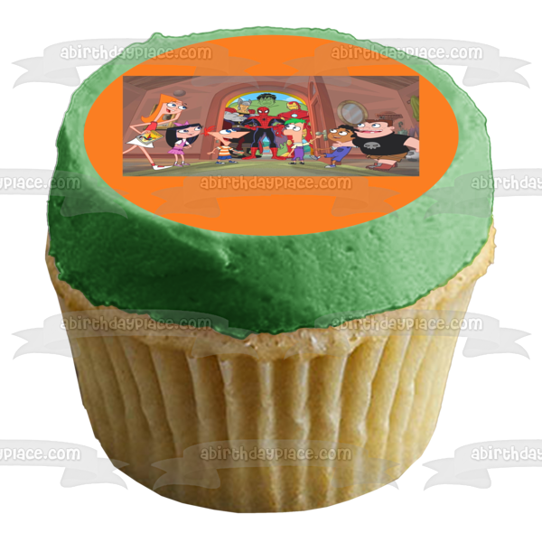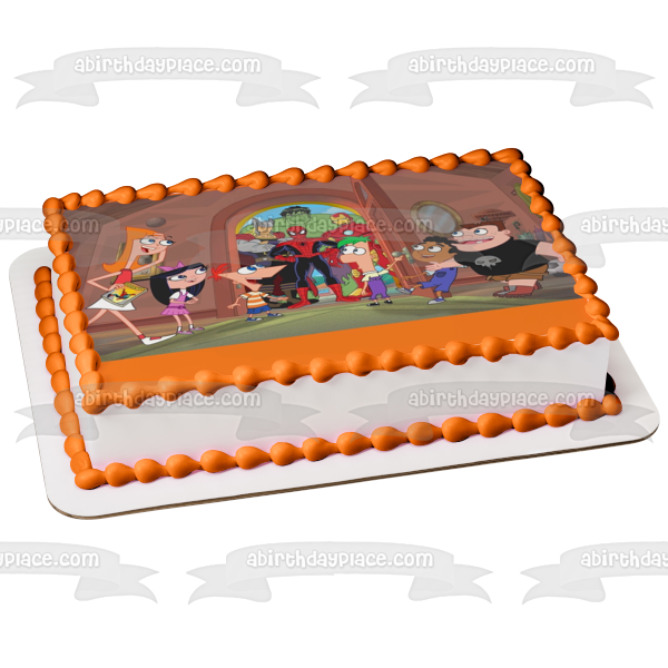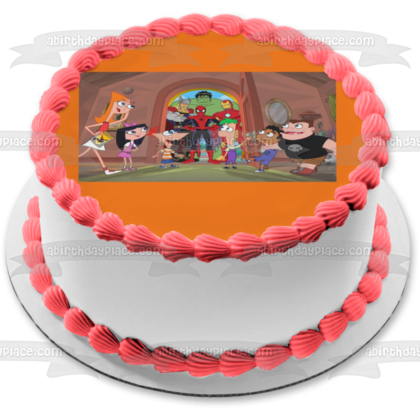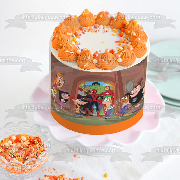 Celebrate your Phineas and Ferb fanatic with this Edible Cake Topper Image featuring Phineas Flynn, Ferb Fletcher, Spider-Man, Iron Man, The Hulk and Captain America, Isabella Garcia-Shapiro and Candace Flynn!