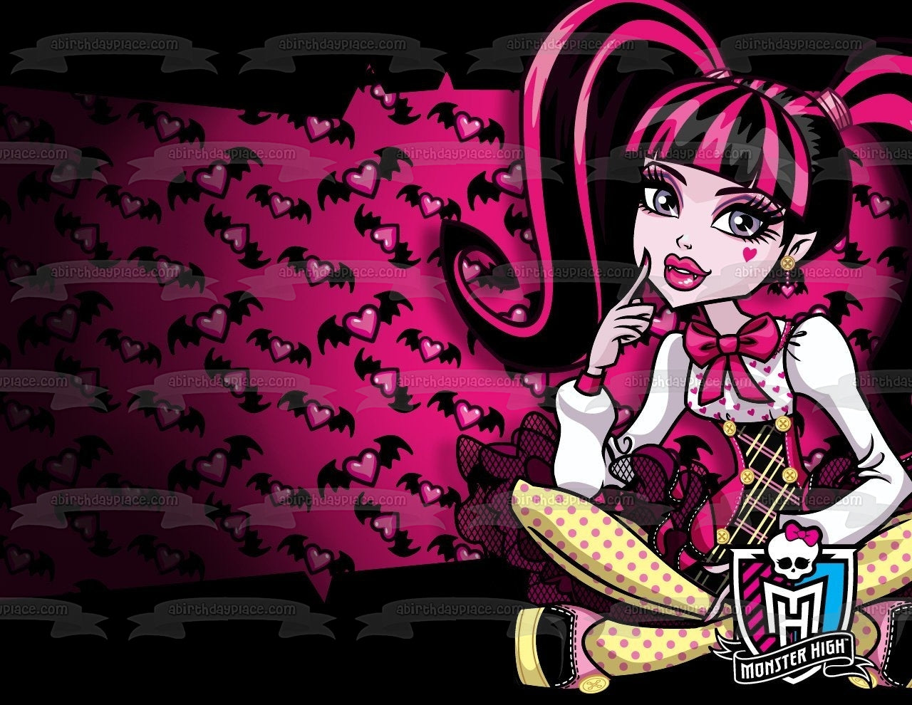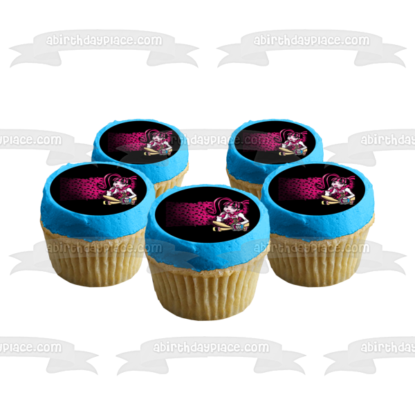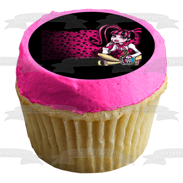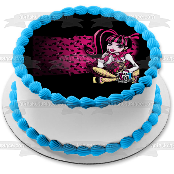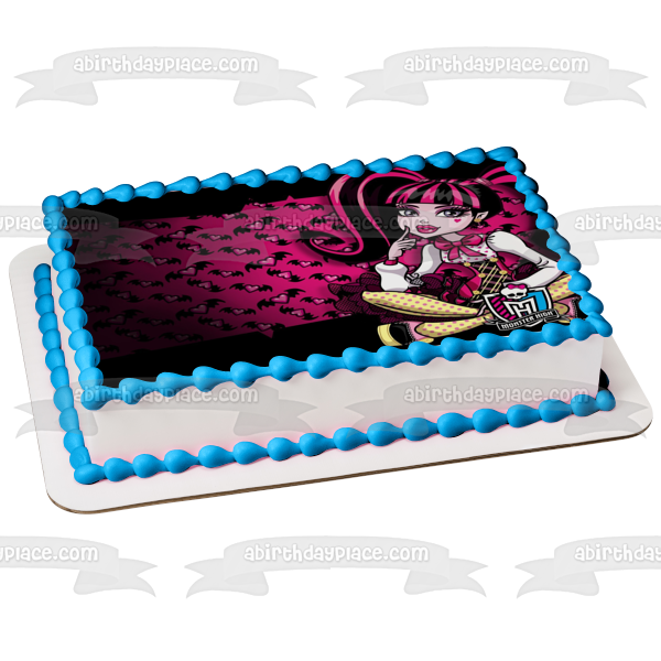 Celebrate your Monster High fanatic with this Edible Cake Topper Image featuring Draculaura with a Hearts and Bats Background!