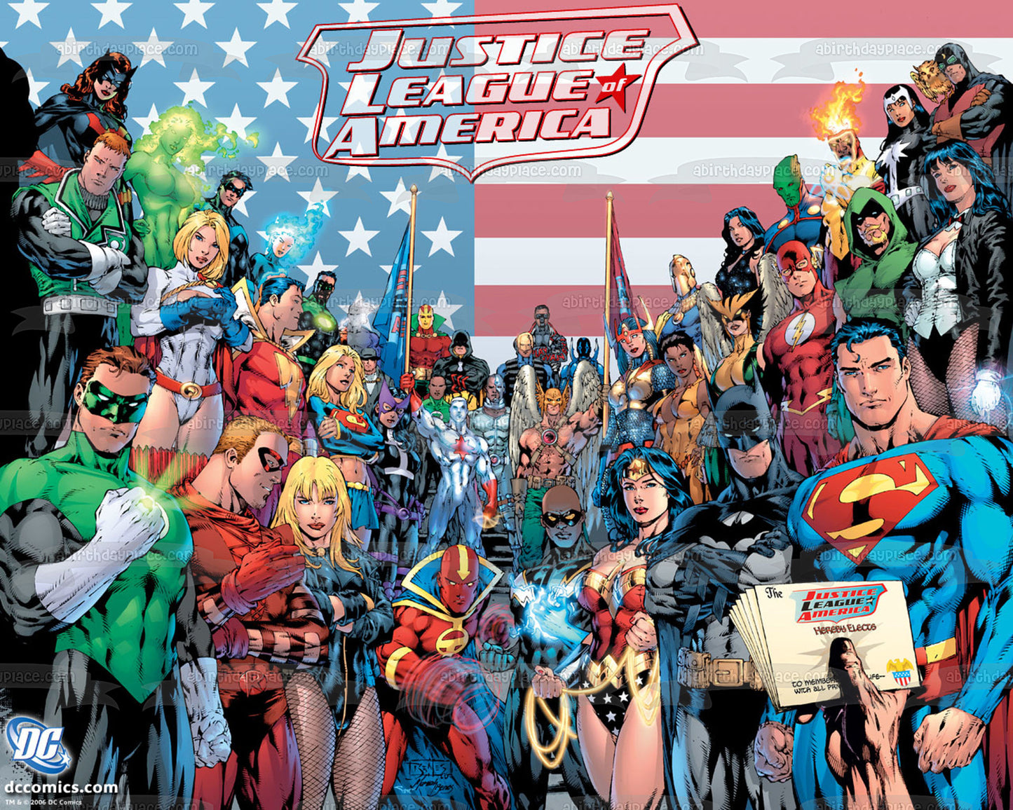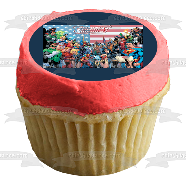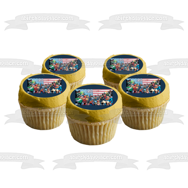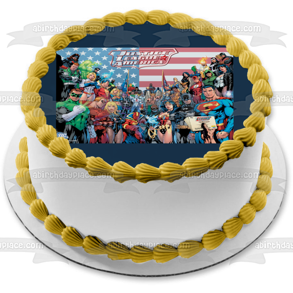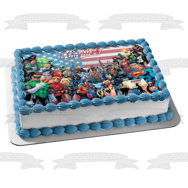 Celebrate your special event with this Superhero themed Edible Cake Topper Image featuring Superman, Batman, Wonder Woman, Green Lantern, The Flash, Aquaman, Green Arrow, Atom and Black Canary!