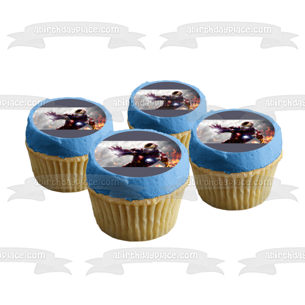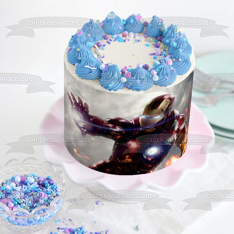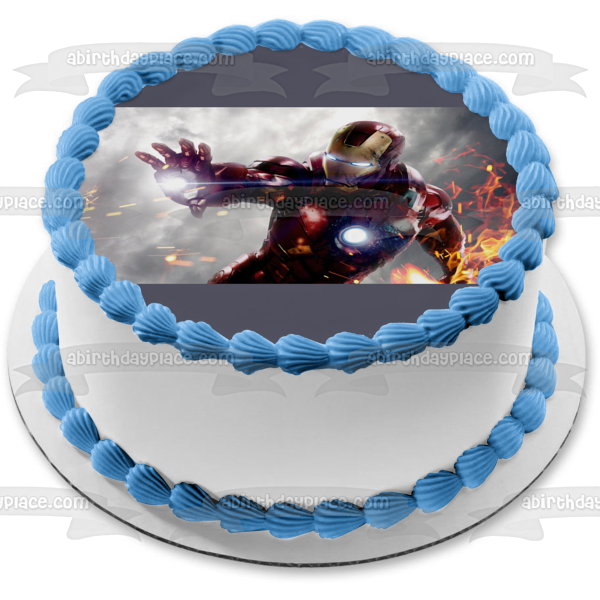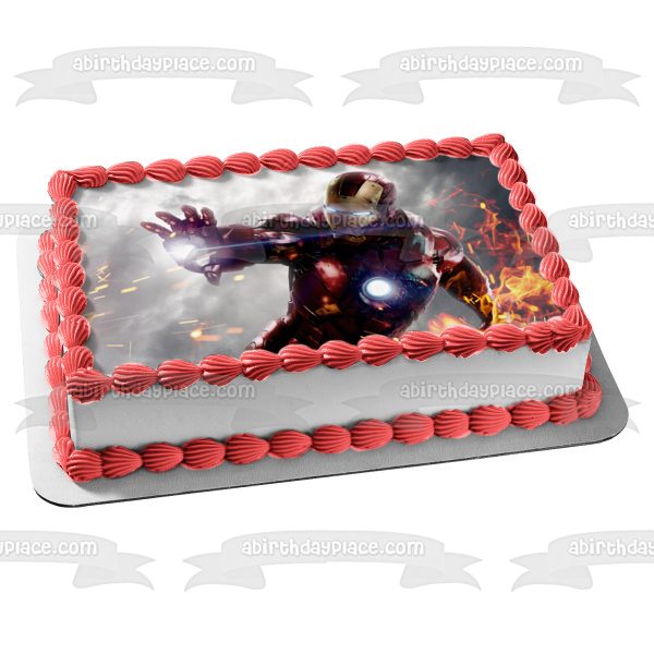 Celebrate your special event with this Superhero themed Edible Cake Topper Image featuring Iron Man Flying over a Grey Sky and Fire!