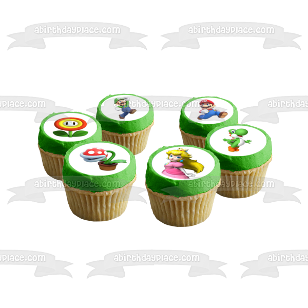 Celebrate your special event with these 15 Count Super Mario themed Edible Cupcake Topper Images featuring Luigi, Yoshi, Toad, Starman, Princess Peach and a Green Star!