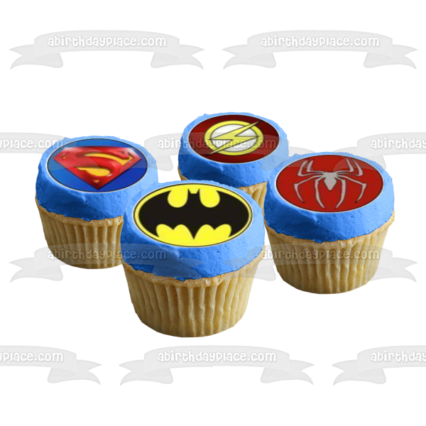 Decorate your Cupcakes with these 30 Count Superhero Logo themed Edible Cupcake Topper Images featuring Captain America, The Flash, Batman, Green Lantern, Spider-Man and Superman!