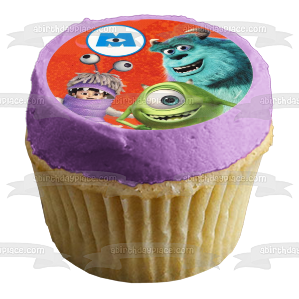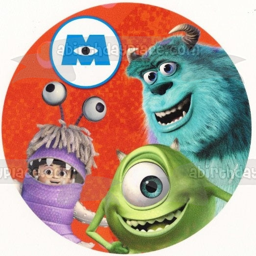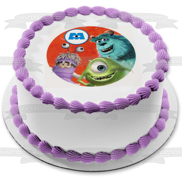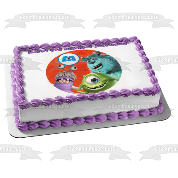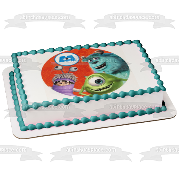 Decorate your Cake with this Monsters Inc. themed Edible Cake Topper Image featuring Boo, Sullivan and Mike Kwazoski with a Red Background!