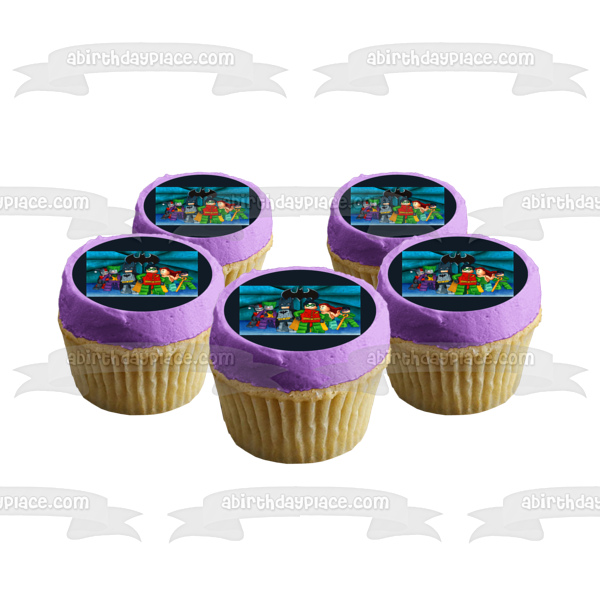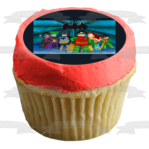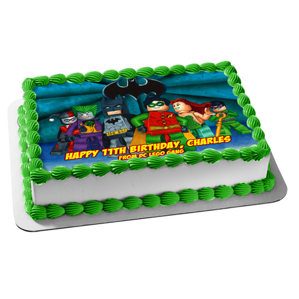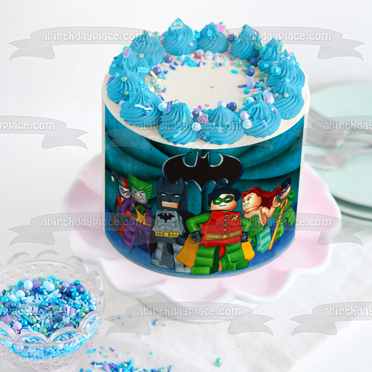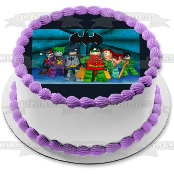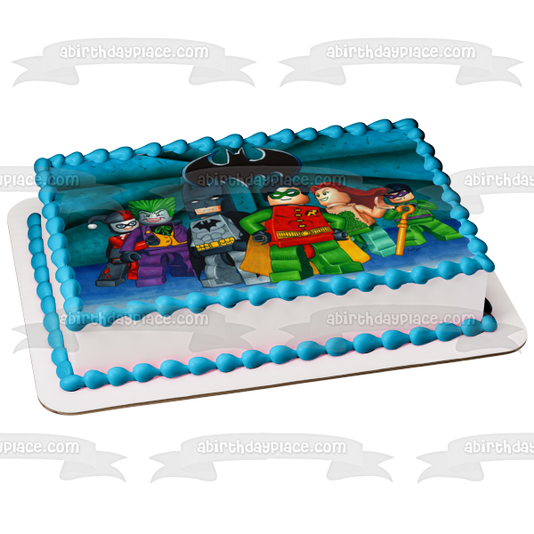 Decorate your Cake with this LEGO Batman themed Edible Cake Topper Image featuring The Joker, Robin, Harley Quinn and Poison Ivy!