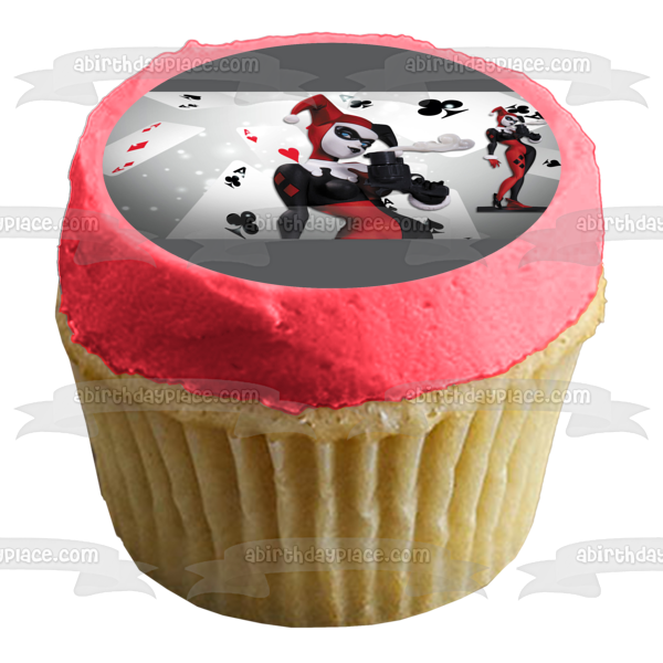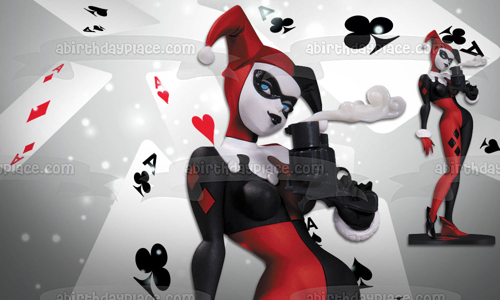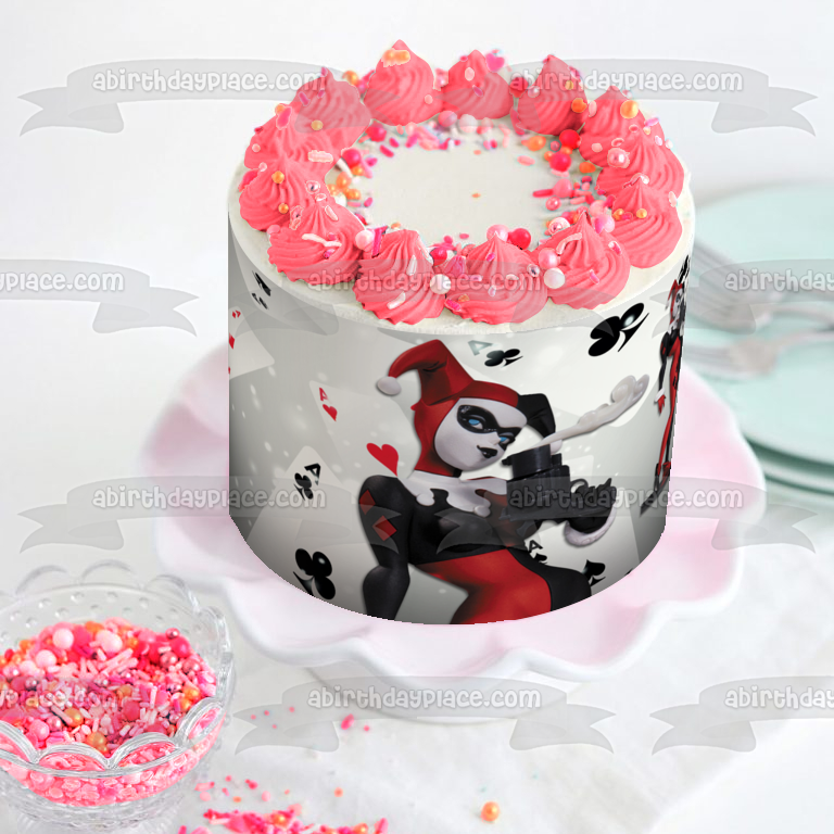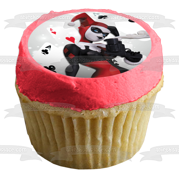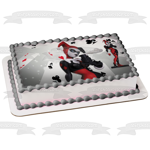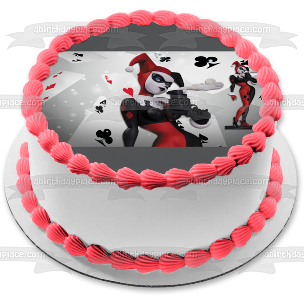 Celebrate your Superhero fanatic with this Edible Cake Topper Image featuring Harley Quinn and her Revolver surrounded by Ace Playing Cards!