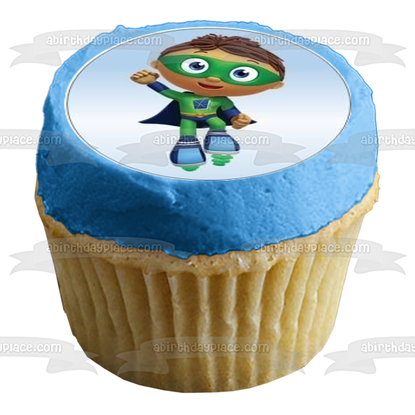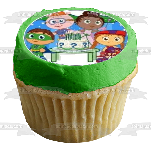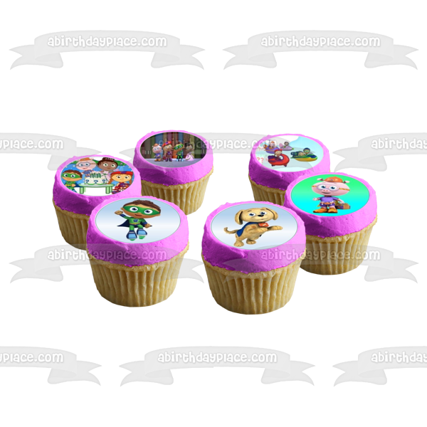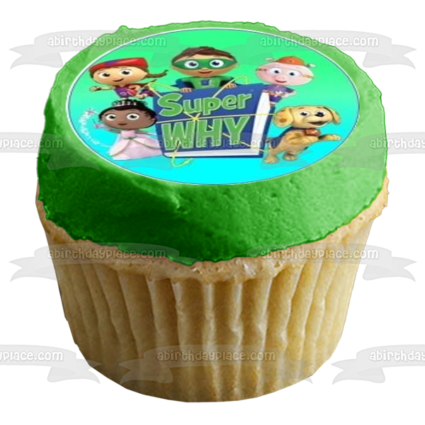 Celebrate your special day with these 12 Count Super Why Happy Birthday themed Edible Cupcake Topper Images featuring Whyatt, Pig, Princess Pea, Little Red Riding Hood, Woofster, a Pinata, a Cake and Balloons!