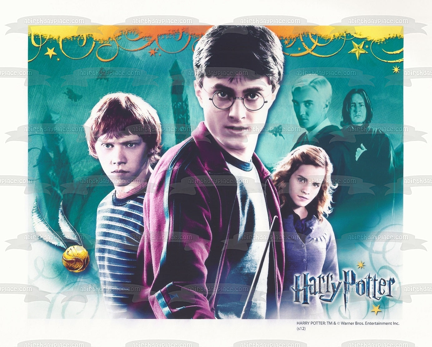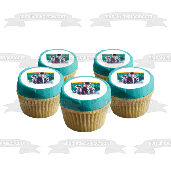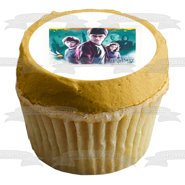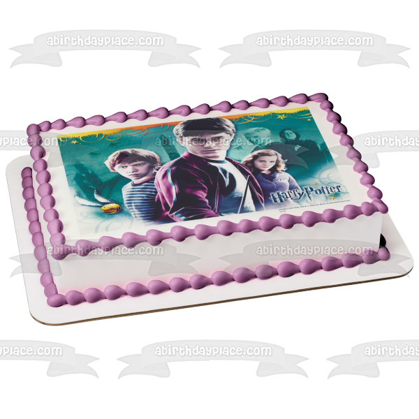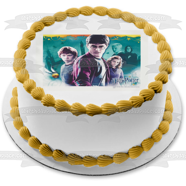 Decorate your Cake with this Harry Potter themed Edible Cake Topper Image featuring Hermione Granger, Ron Weasley, Professor Serverus Snape, Draco Malfoy and a Blue Background!