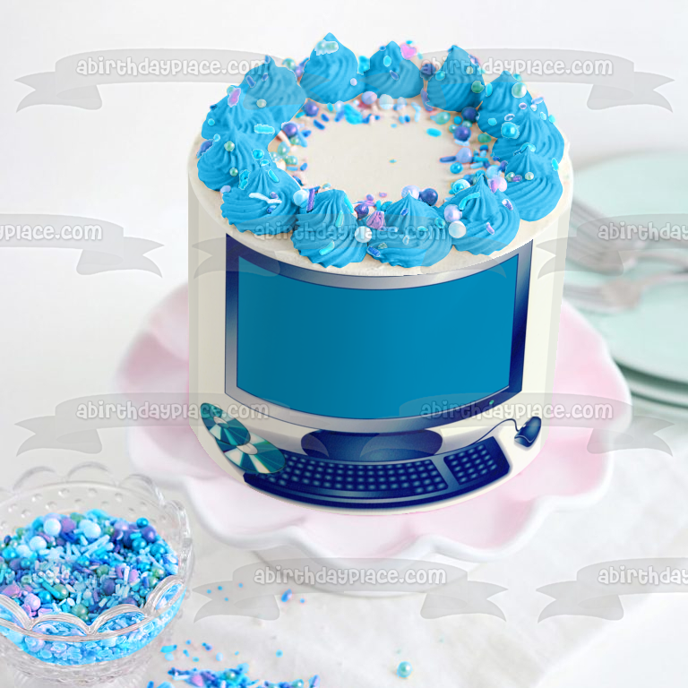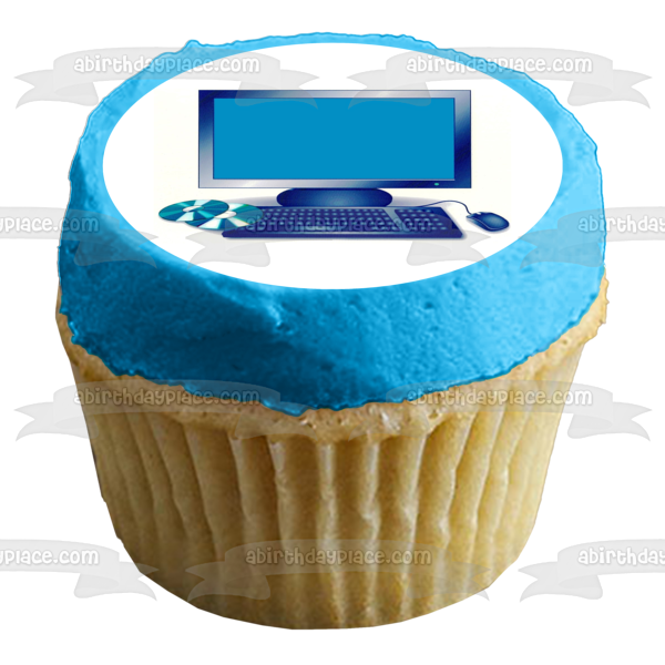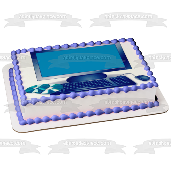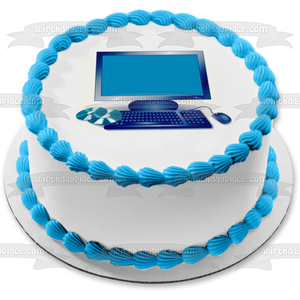 Decorate your Cake with this Personal Computer themed Edible Cake Topper Image featuring a Blue Monitor, Keyboard, Mouse and CD's!