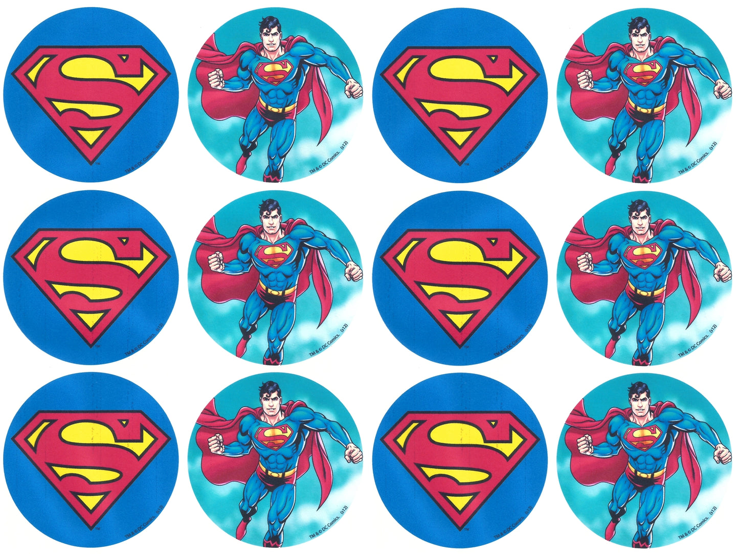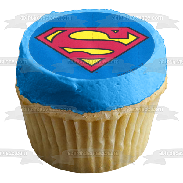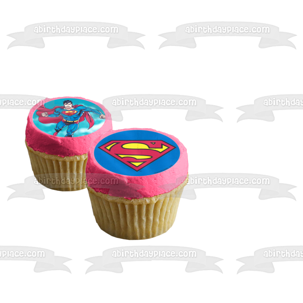 Decorate your Cupcakes with these 12 Count Superhero themed Edible Cupcake Topper Images featuring Superman's Logo and Him Flying on a Blue Background!