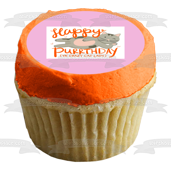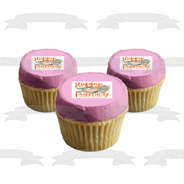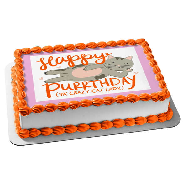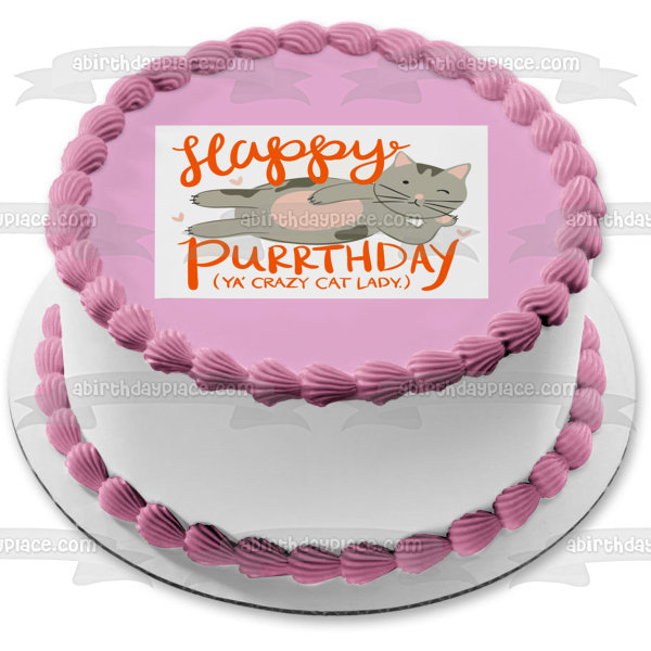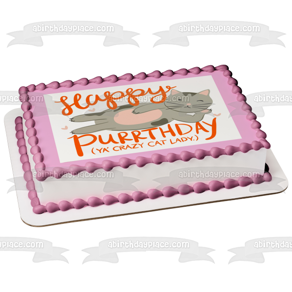 Decorate your Cake with this Happy Birthday Crazy Cat Lady themed Edible Cake Topper Image featuring a Grey Cat and Purple Heartis!