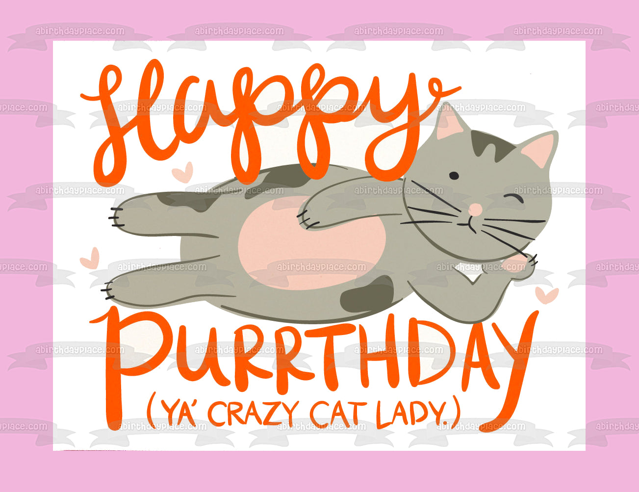 Happy Purrthday Ya Crazy Cat Lady Grey Cat and Purple Hearts Edible Cake Topper Image ABPID08111