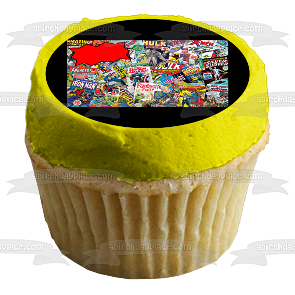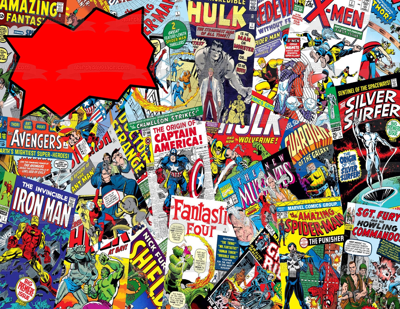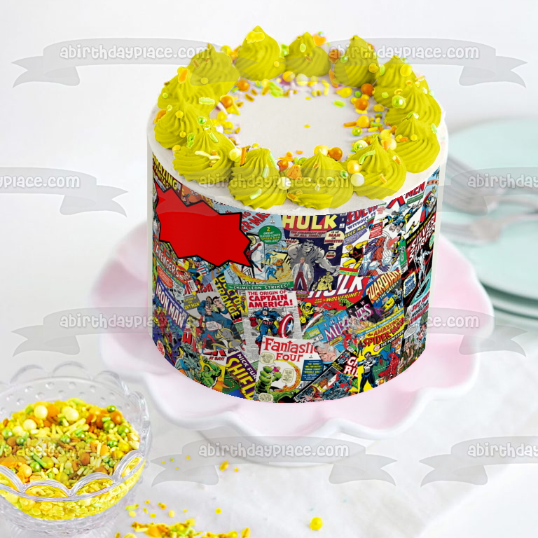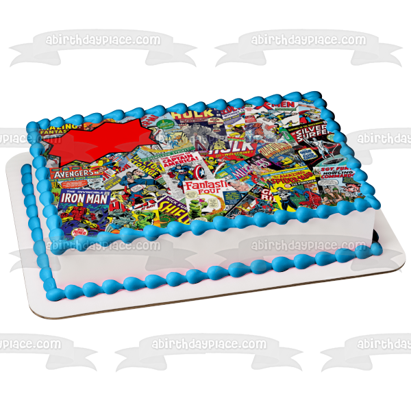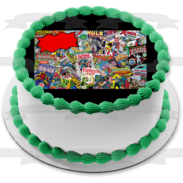 Personalize your Cake with this Comic Book Cover themed Edible Cake Topper Image featuring The Avengers, The Hulk, Spider-Man, Silver Surfer, Fantastic Four, X-Men, Iron Man and Thor!