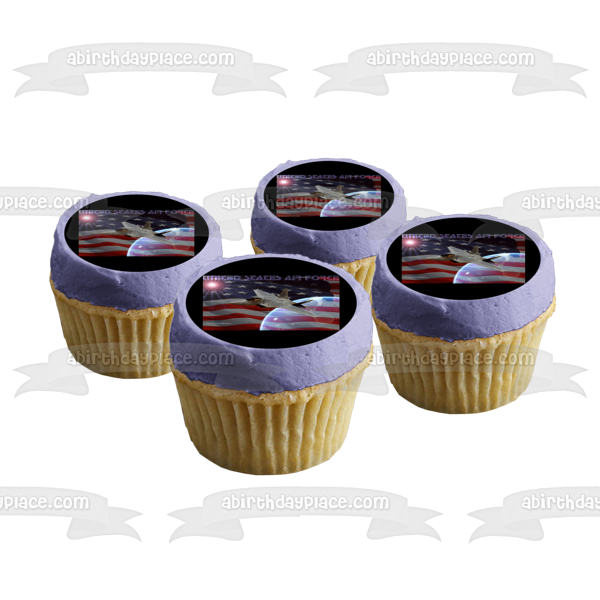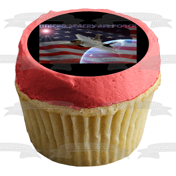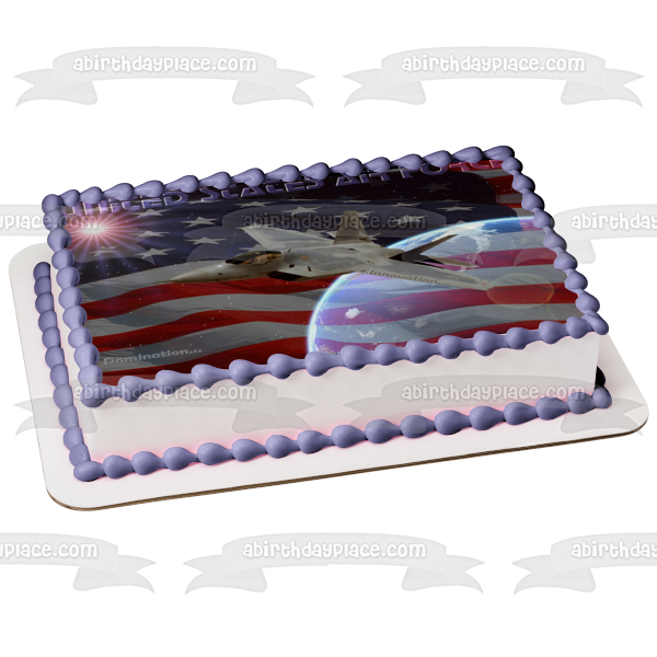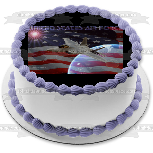 Decorate your Cake with this United States Air Force themed Edible Cake Topper Image featuring a Fighter Plane and the American Flag!