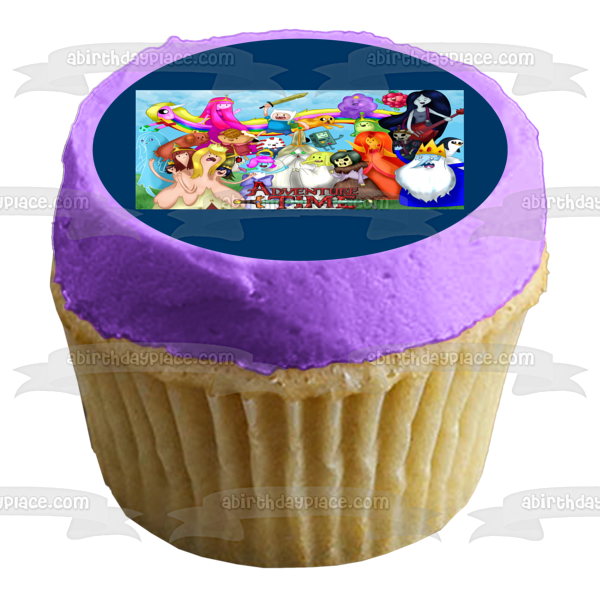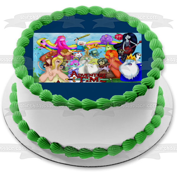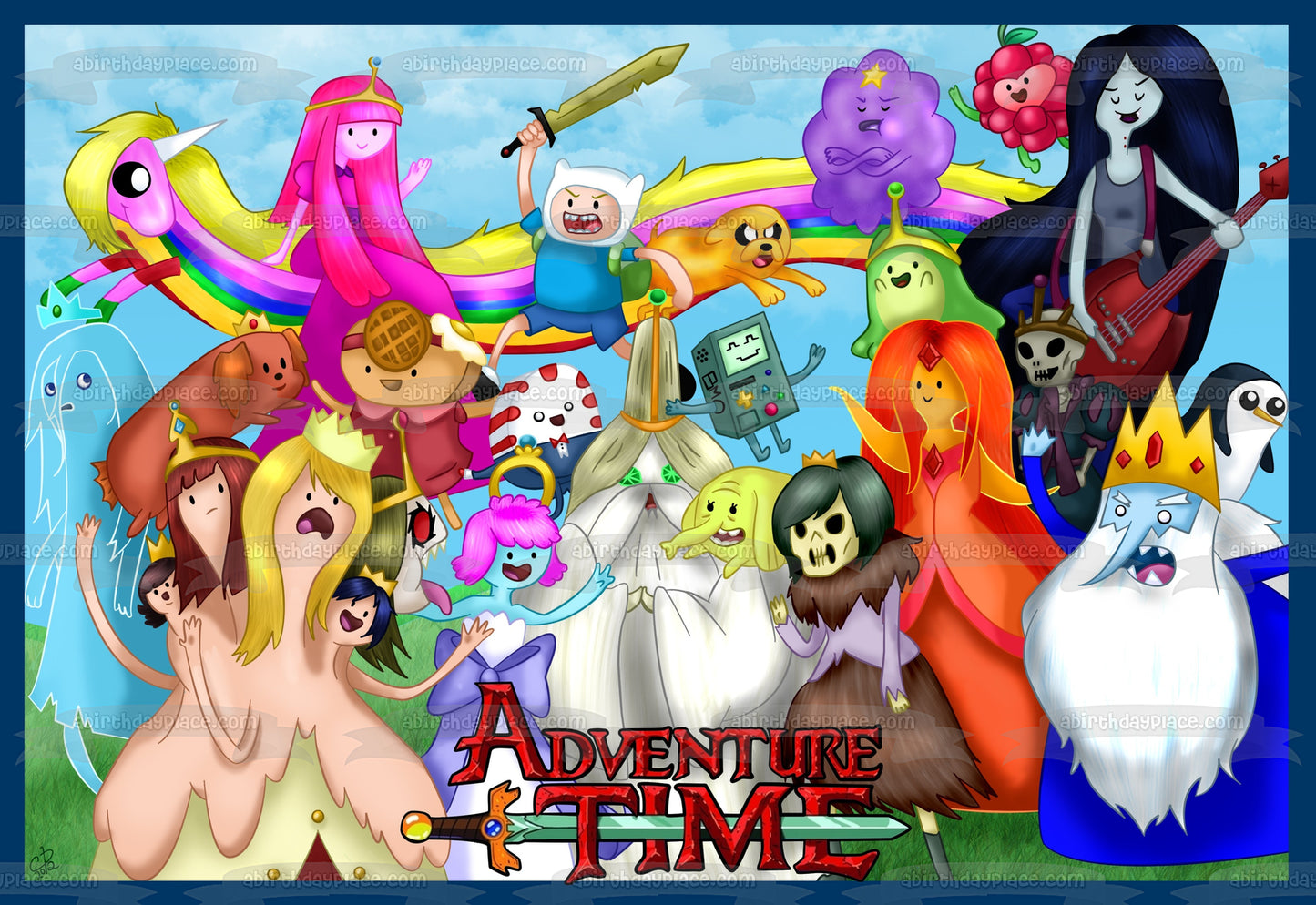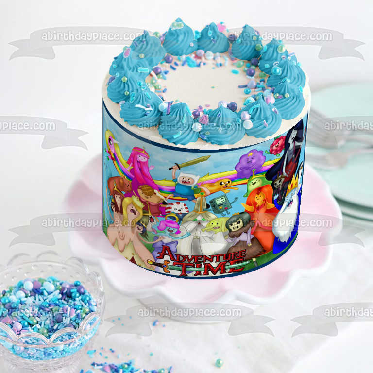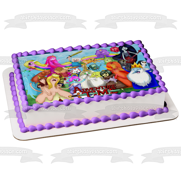 Decorate your Cake with this Adventure Time themed Edible Cake Topper Image featuring Finn, Jake the Dog, Princess Bubblegum, Ice King, Beemo, Lumpy Space Princess and Flame Princess!