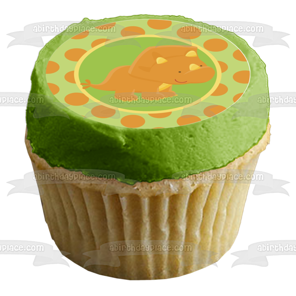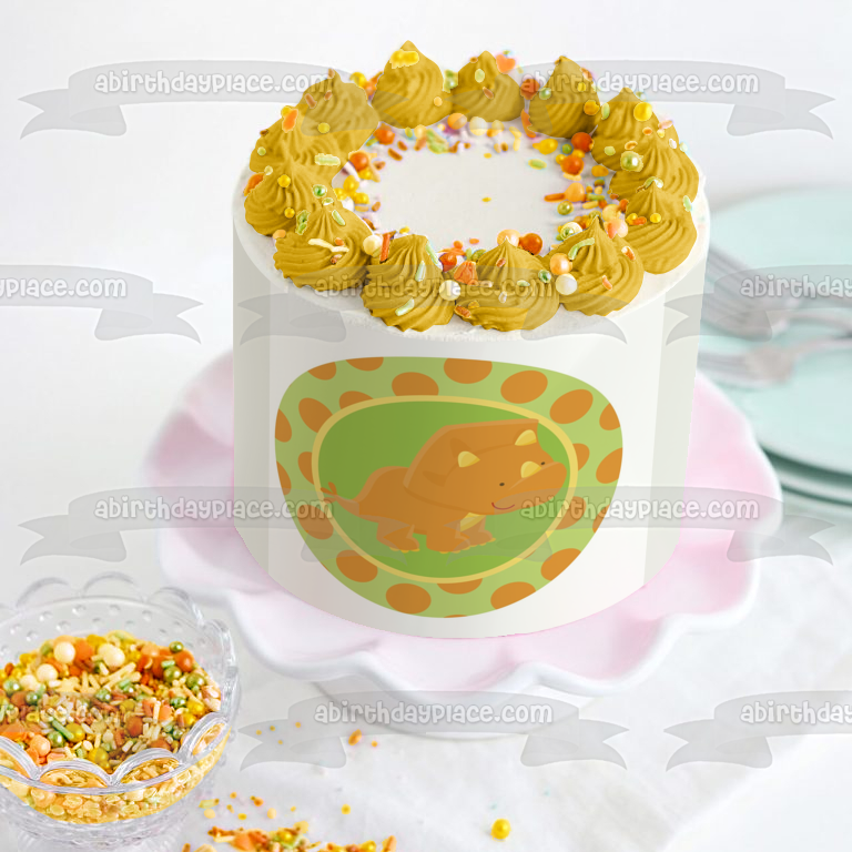 Decorate your Cake with this Baby Brown Dinosaur themed Edible Cake Topper Image featuring a Green and Brown Polka Dot Background!
