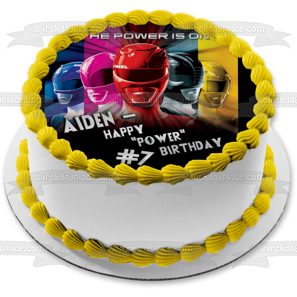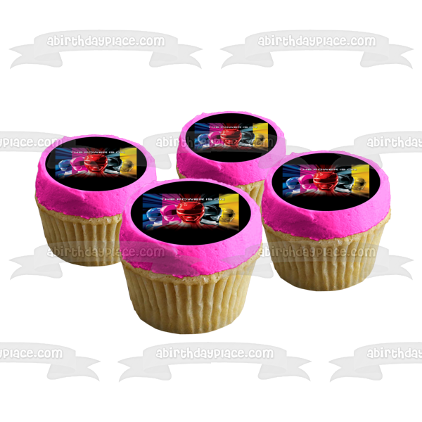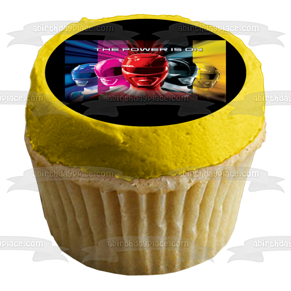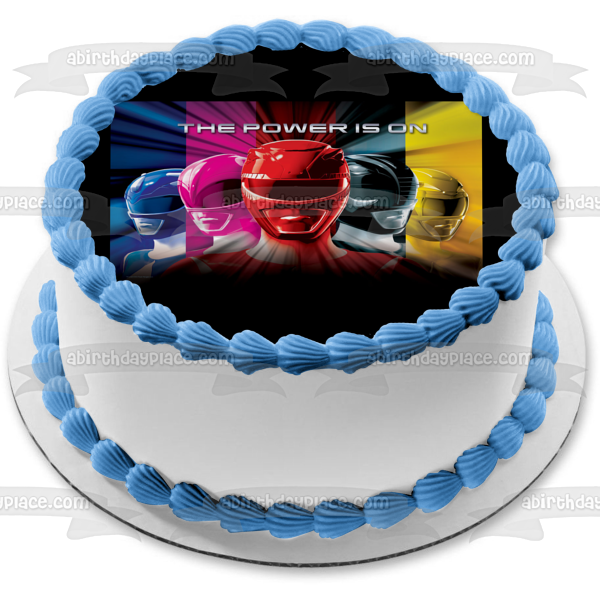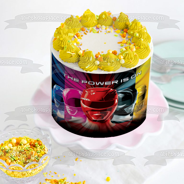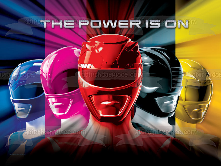 Decorate your Cake with this Power Rangers themed Edible Cake Topper Image featuring the Black, Yellow, Red, Blue and Pink Rangers under the words "The Power Is On"!