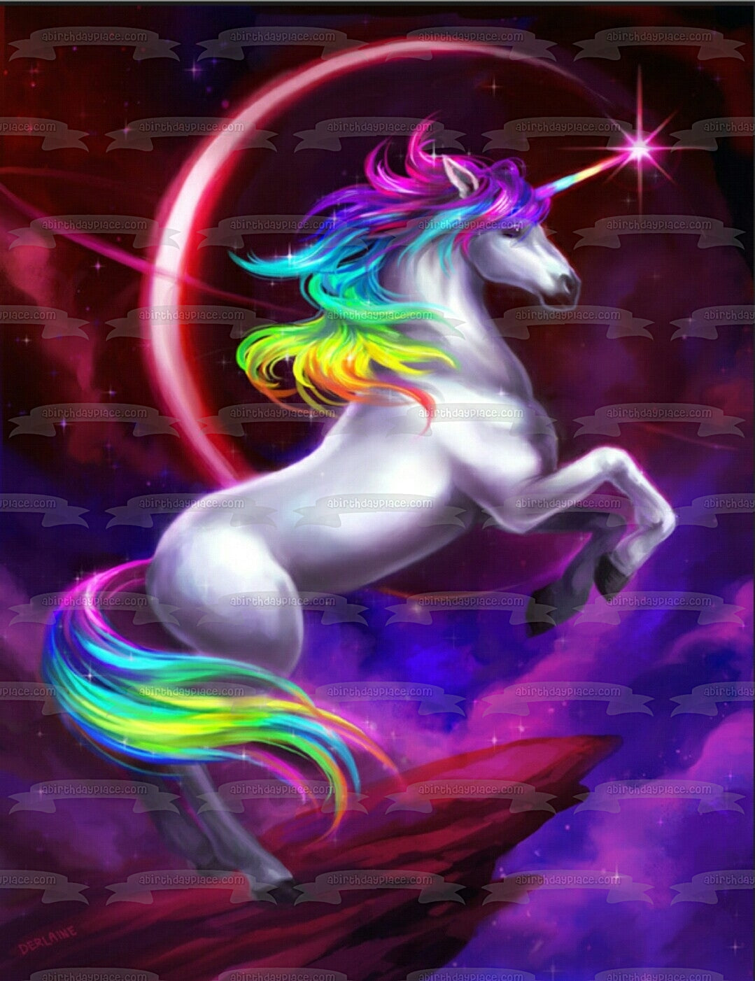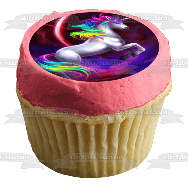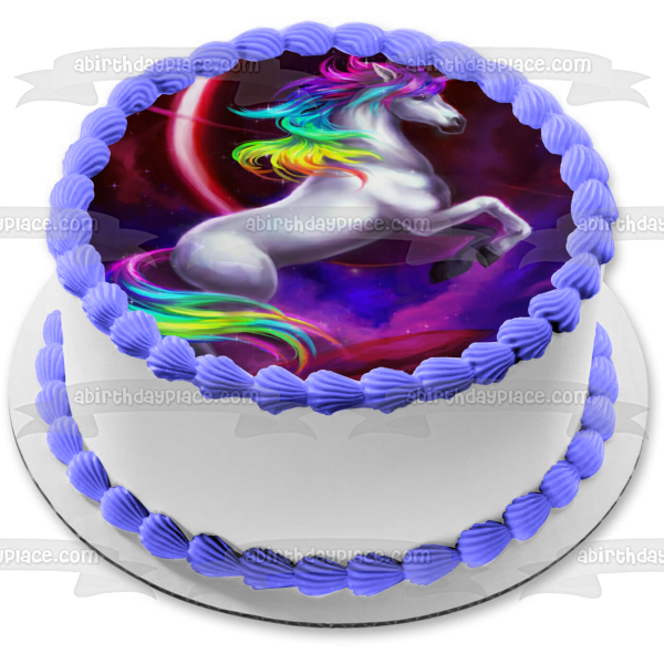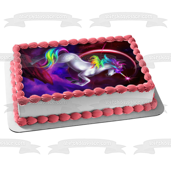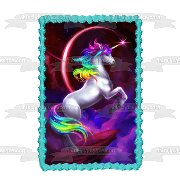 Decorate your Cake with this Unicorn themed Edible Cake Topper Image featuring a White Unicorn with Rainbow Colored Hair in front of a Space Background with a Ringed Planet!