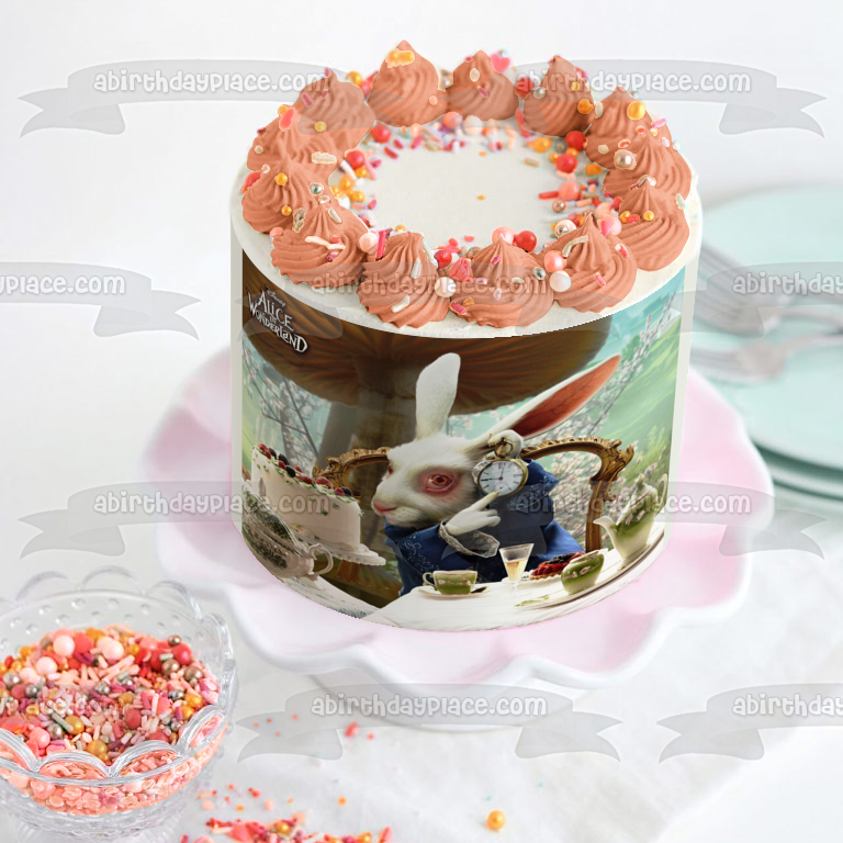 Decorate your Cake with this Disney themed Edible Cake Topper Image featuring the White Rabbit worried about Time from Alice in Wonderland!
