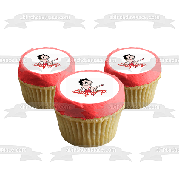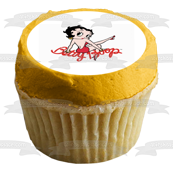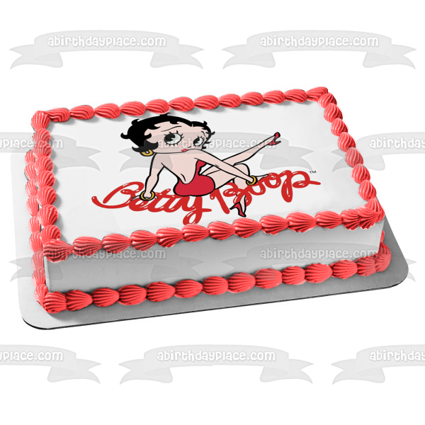 Decorate your Cake with this Betty Boop themed Edible Cake Topper Image Betty Boop, wearing a Red Dress and Hoop Earrings with her Black Hair!