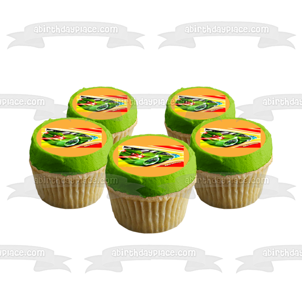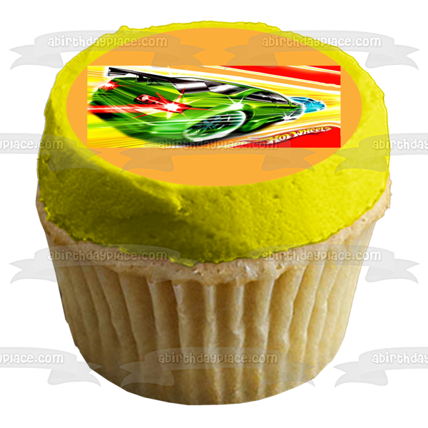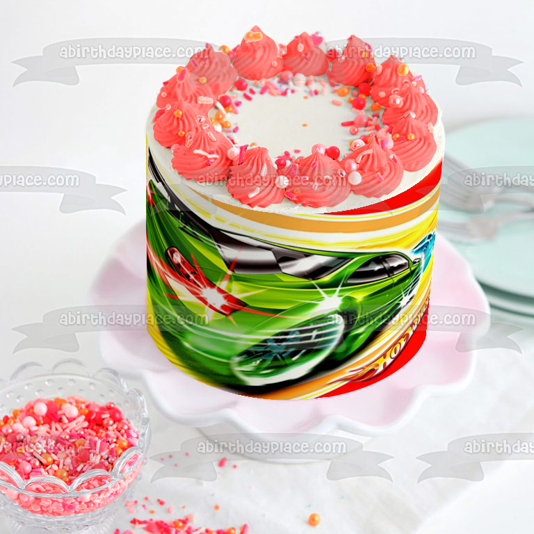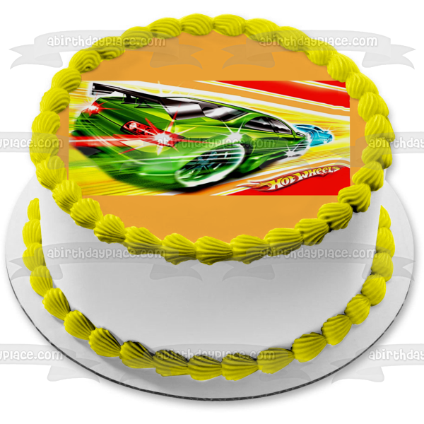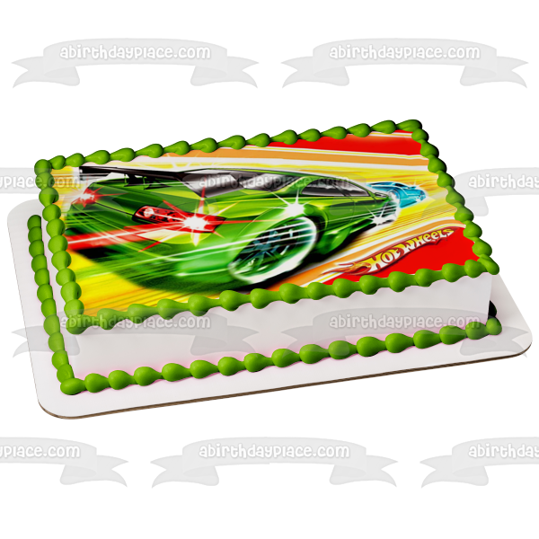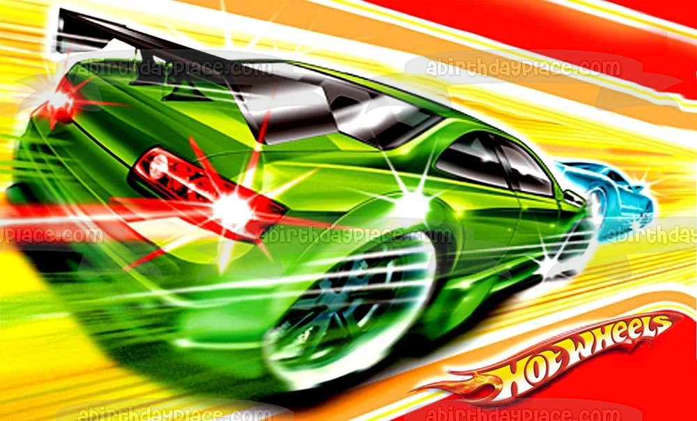 Decorate your Cake with this Mattel themed Edible Cake Topper Image featuring Green and Blue Cars Racing above the Hot Wheels Logo!