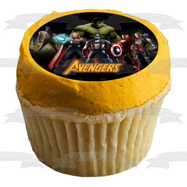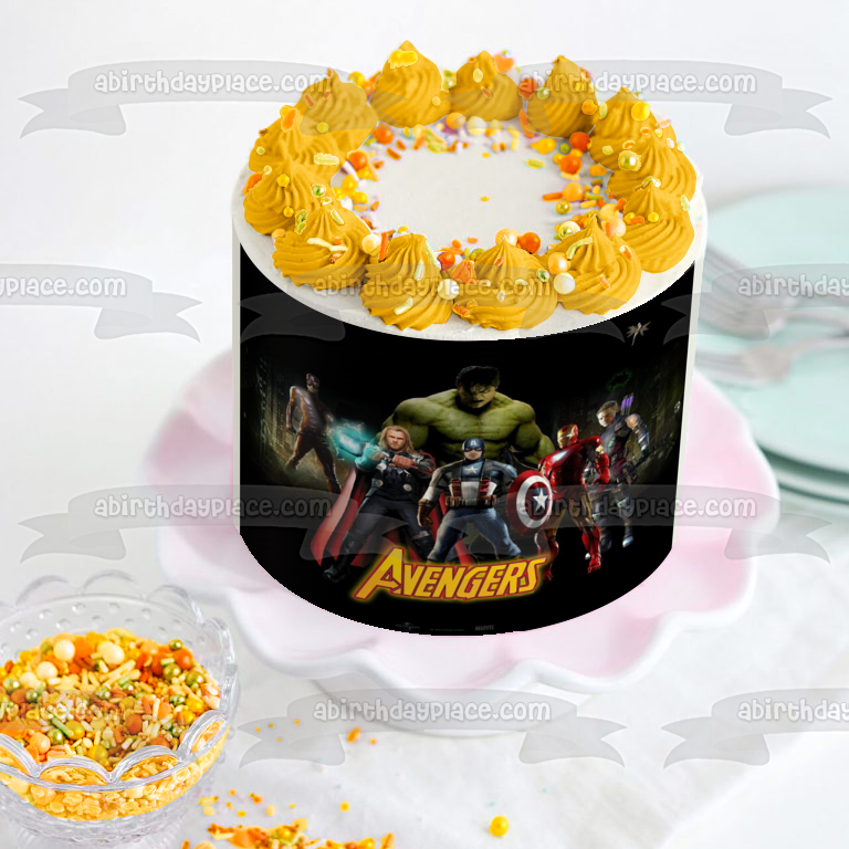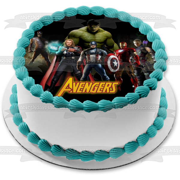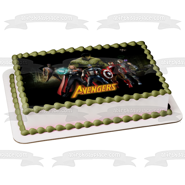 Decorate your Cake with this Marvel Comics themed Edible Cake Topper Image featuring The Avengers including Captain America, Iron Man, Thor and the Incredible Hulk on a Black Background!