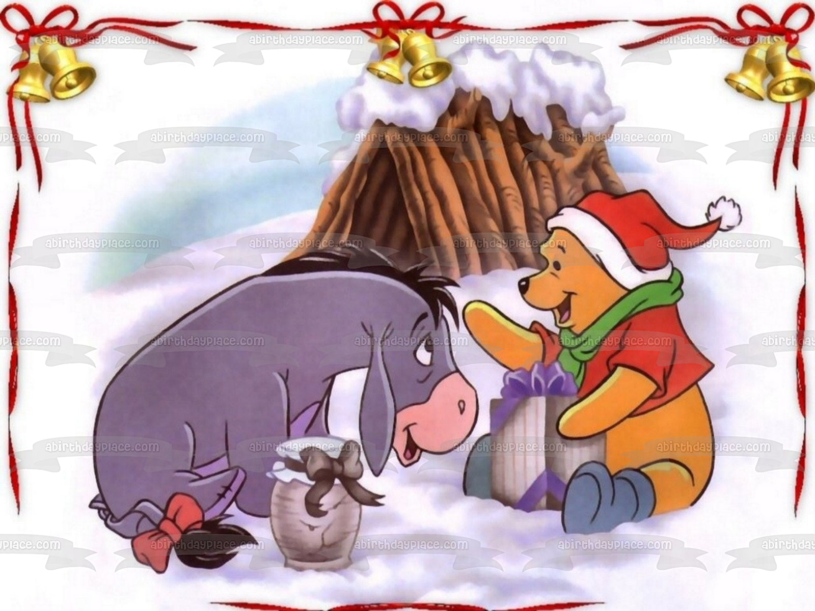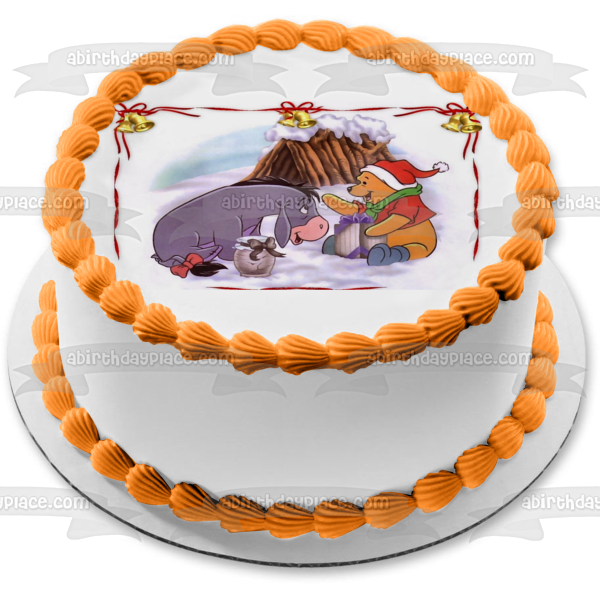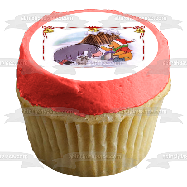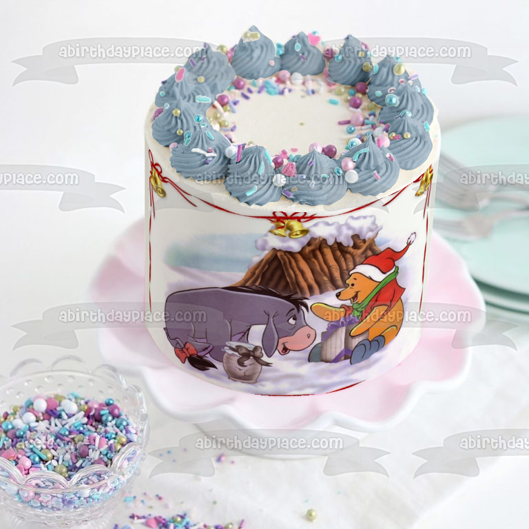 Decorate your Cake with this Disney themed Edible Cake Topper Image featuring Pooh Bear and Eeyore from Winnie the Pooh having a Christmas Celebration!