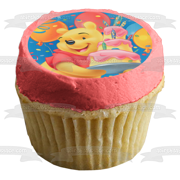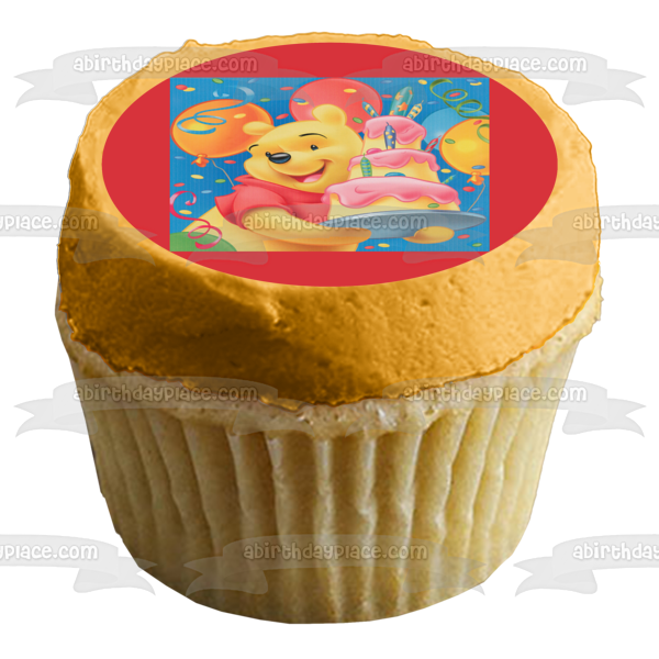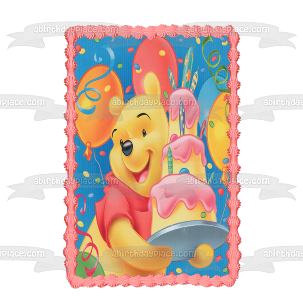 Decorate your Cake with this Disney themed Edible Cake Topper Image featuring Pooh Bear from Winnie the Pooh, carrying a Birthday Cake with Balloons in the Background!
