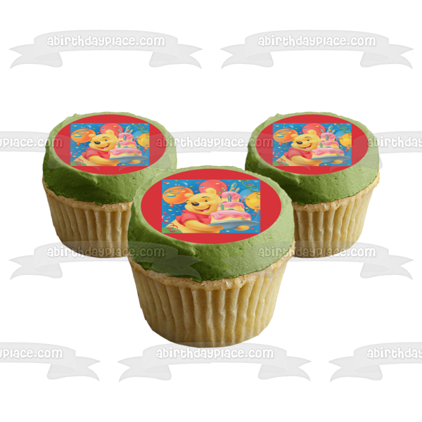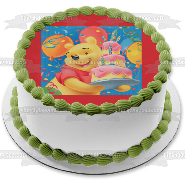 Decorate your Cake with this Disney themed Edible Cake Topper Image featuring Pooh Bear from Winnie the Pooh, carrying a Birthday Cake with Balloons in the Background!