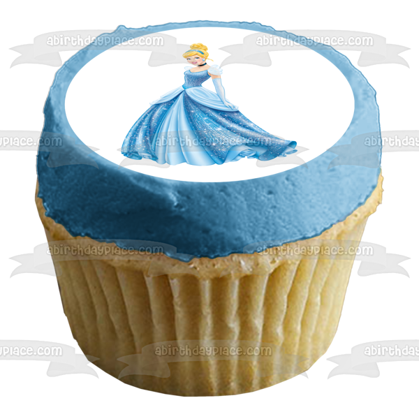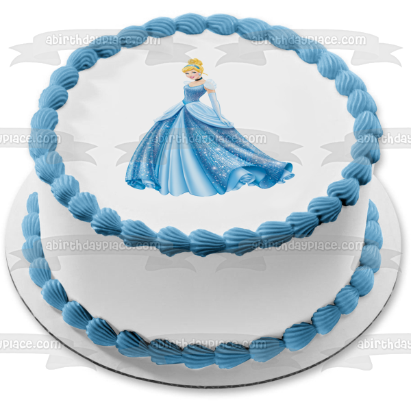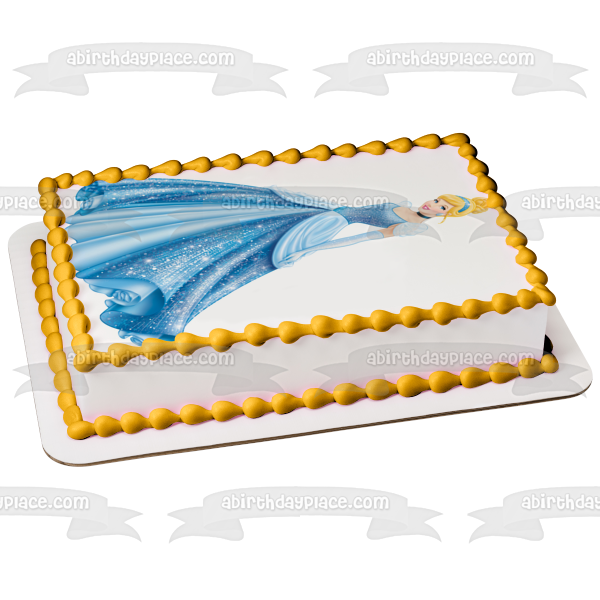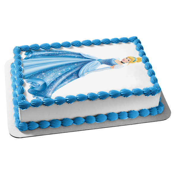 Decorate your Cake with this Disney Princess themed Edible Cake Topper Image featuring Cinderella in a Blue Glitter Ball Gown!