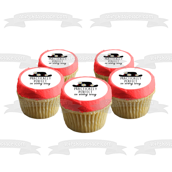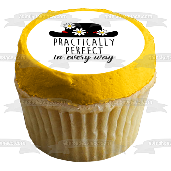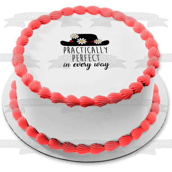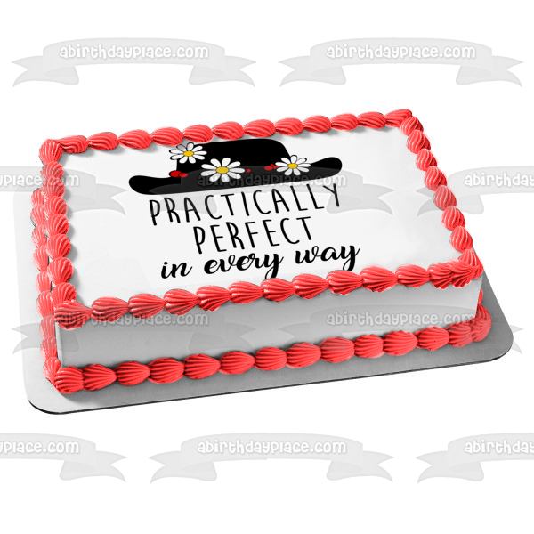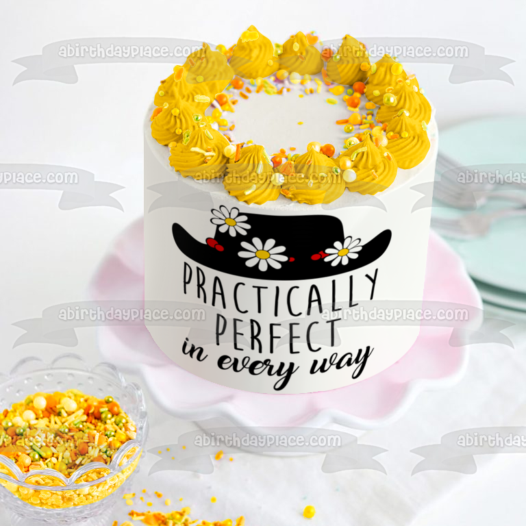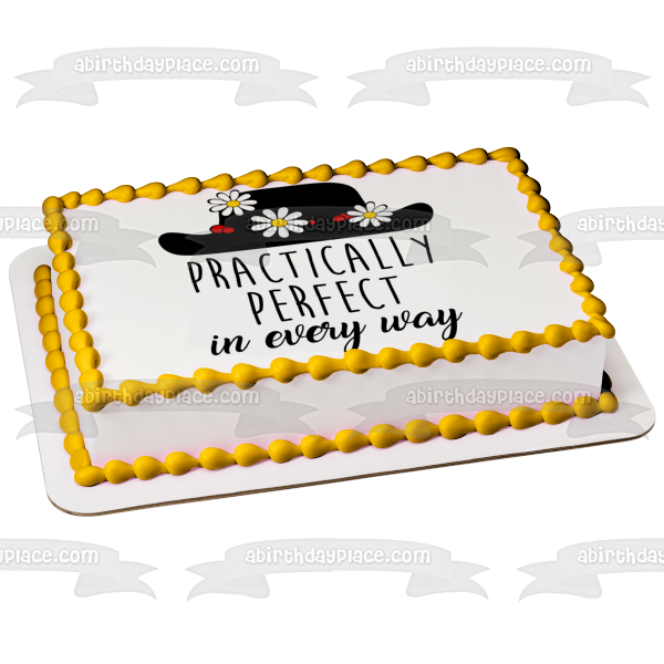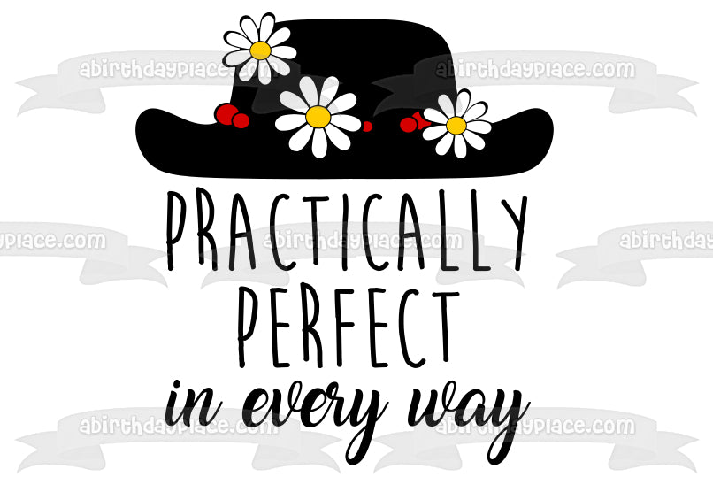 Decorate your Cake with this Black Hat with Flowers themed Edible Cake Topper Image featuring the words Practically Perfect in Every Way.