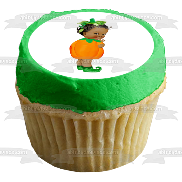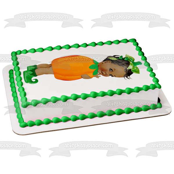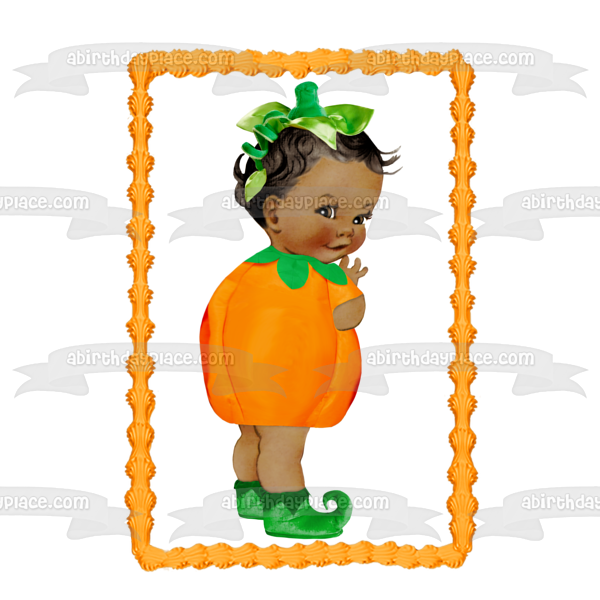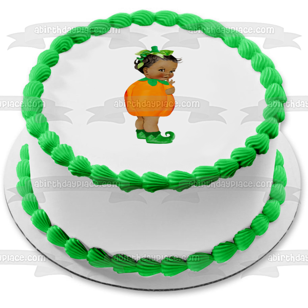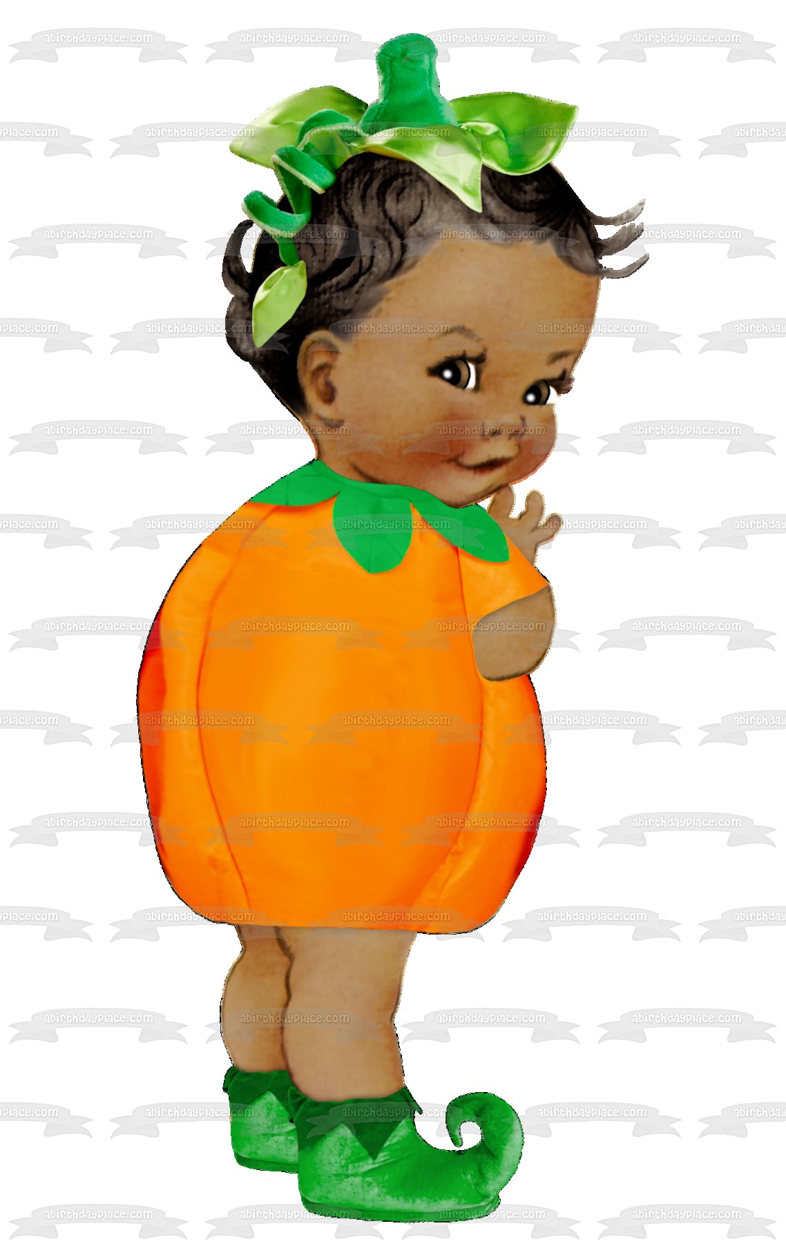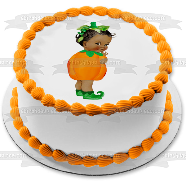Decorate your Cake with this African American Baby Girl themed Edible Cake Topper Image featuring her wearing a Pumpkin Costume!