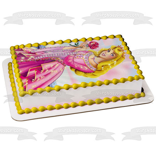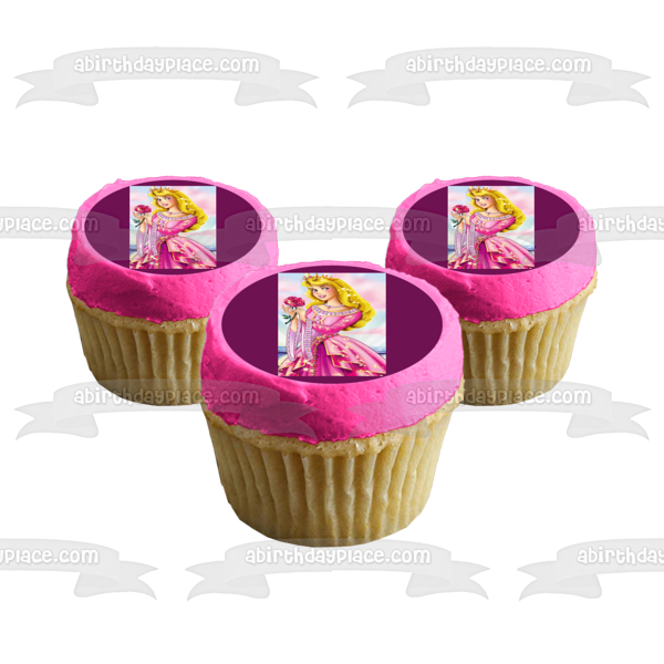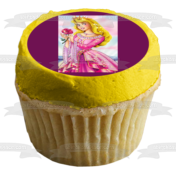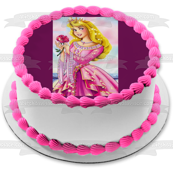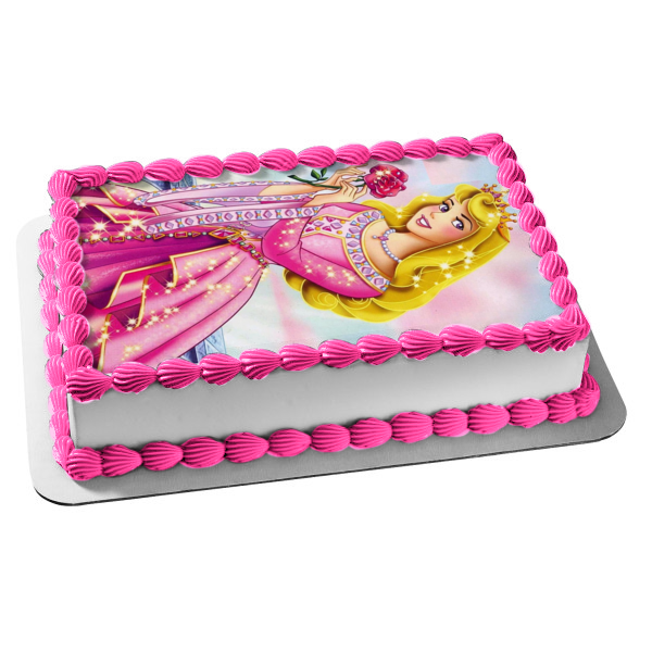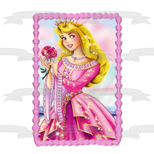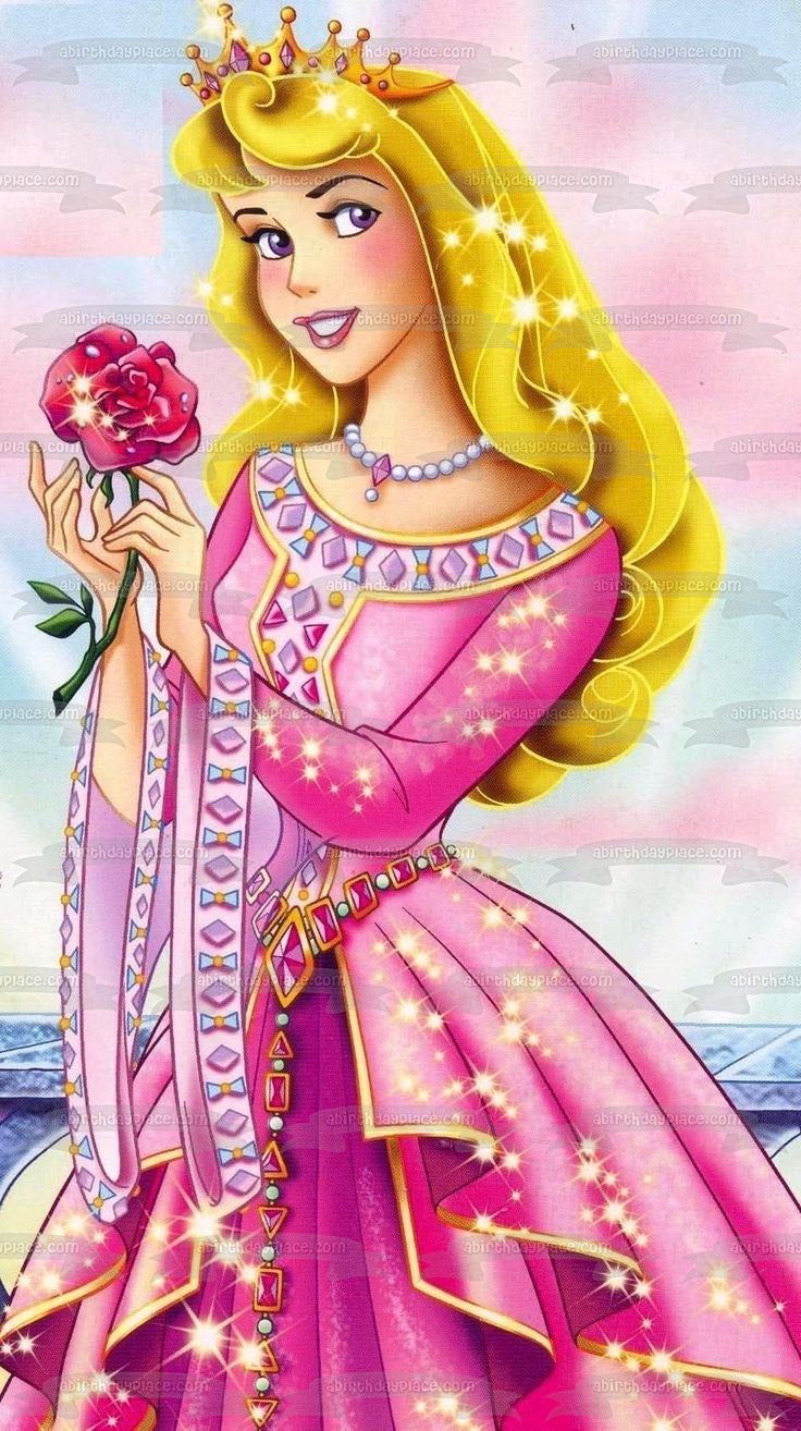 Decorate your Cake with this Sleeping Beauty themed Edible Cake Topper Image featuring Aurora in a Sparkly Ball Gown holding a Rose and wearing a Crown!
