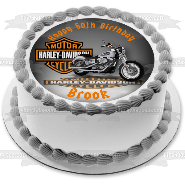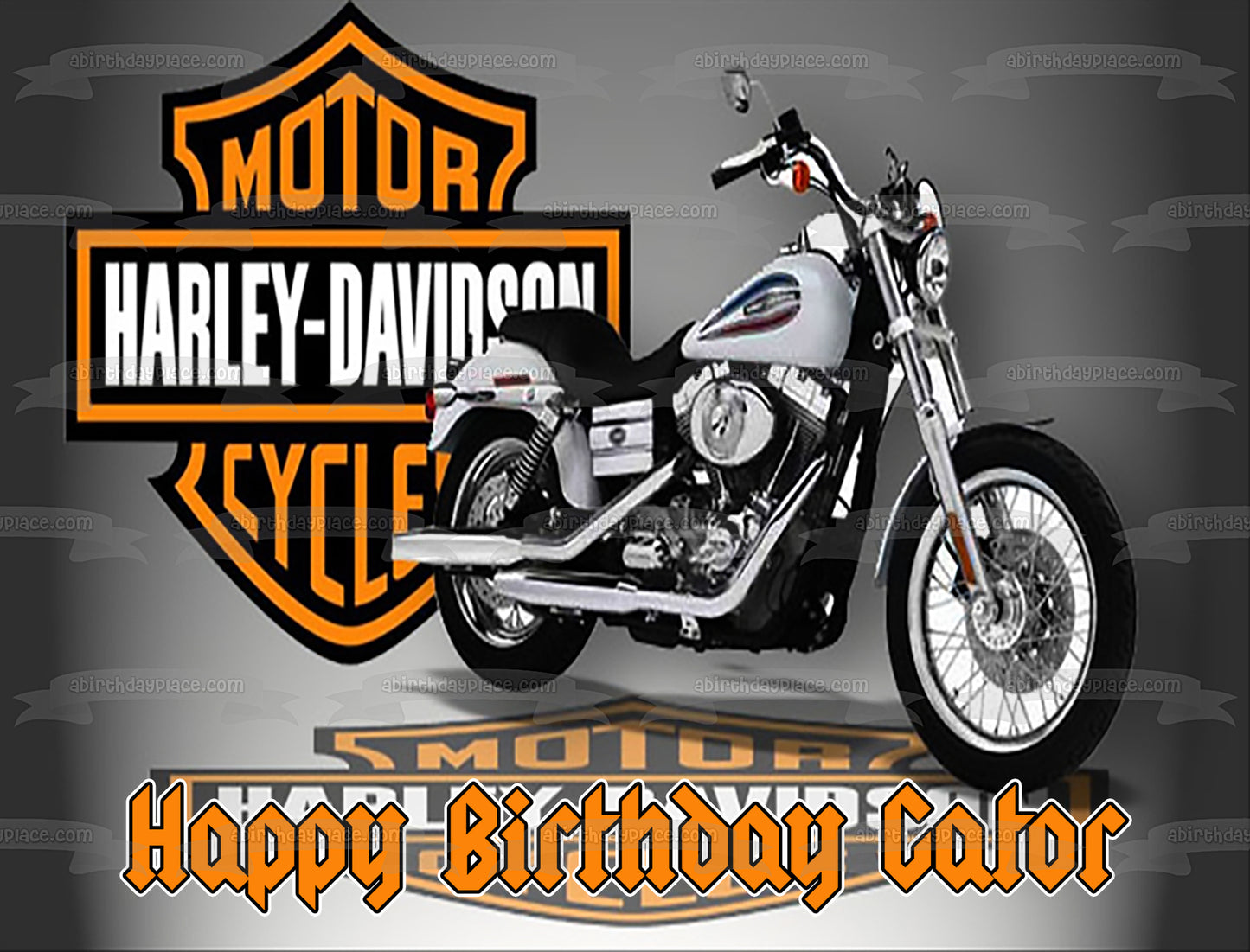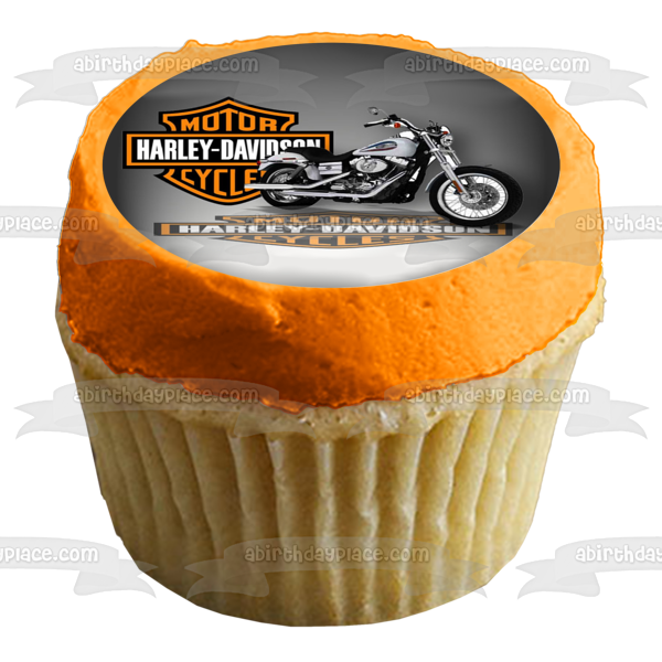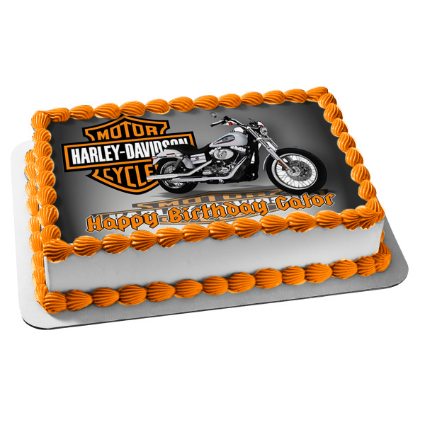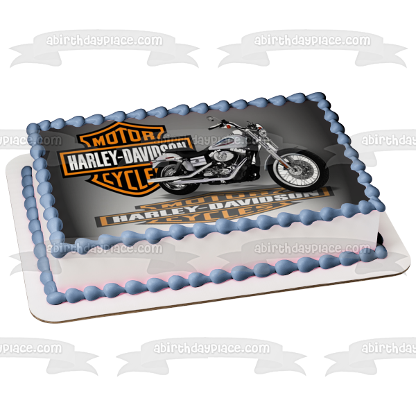 Decorate your Cake with this Harley Davidson Motor Cycle themed Edible Cake Topper Image featuring the Logo and a Silver Motorcycle!