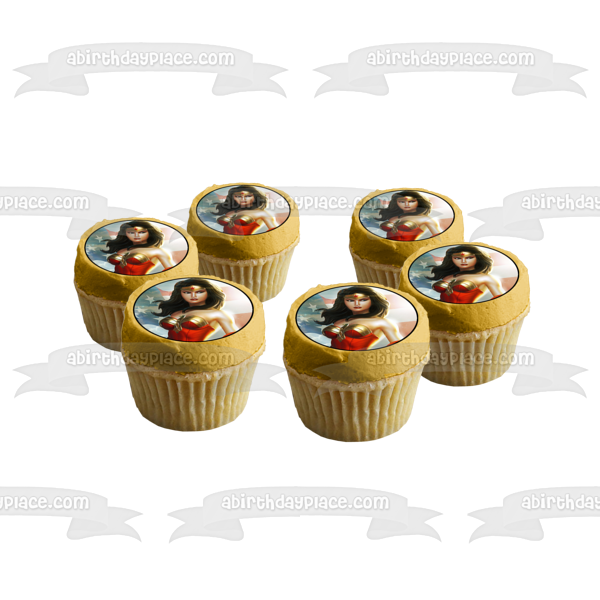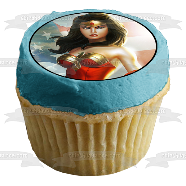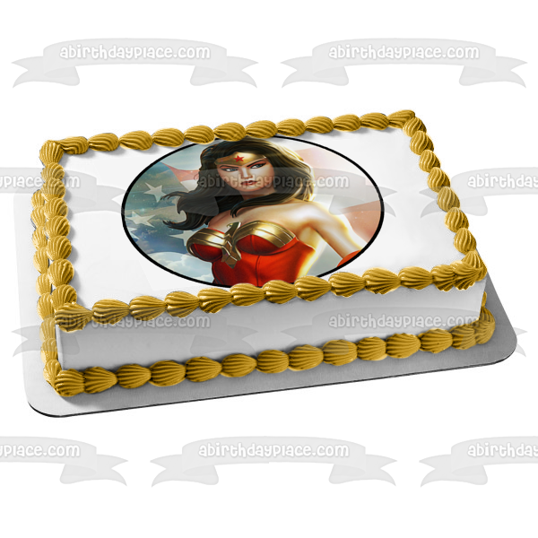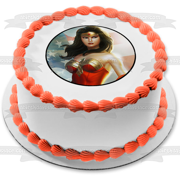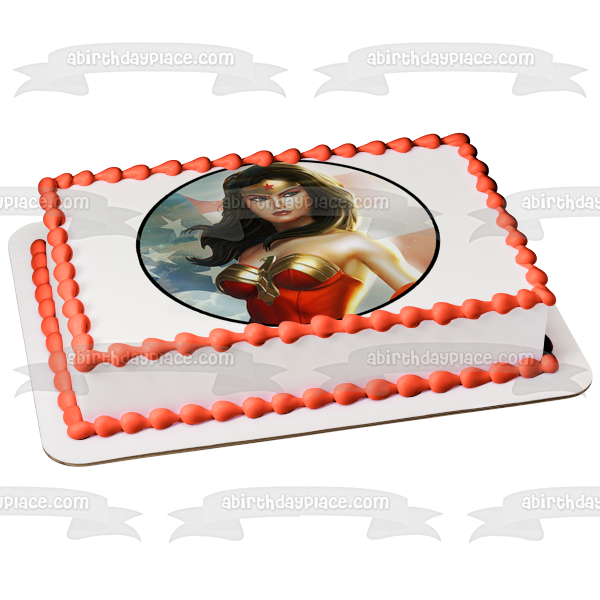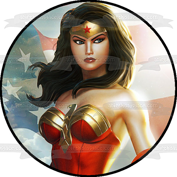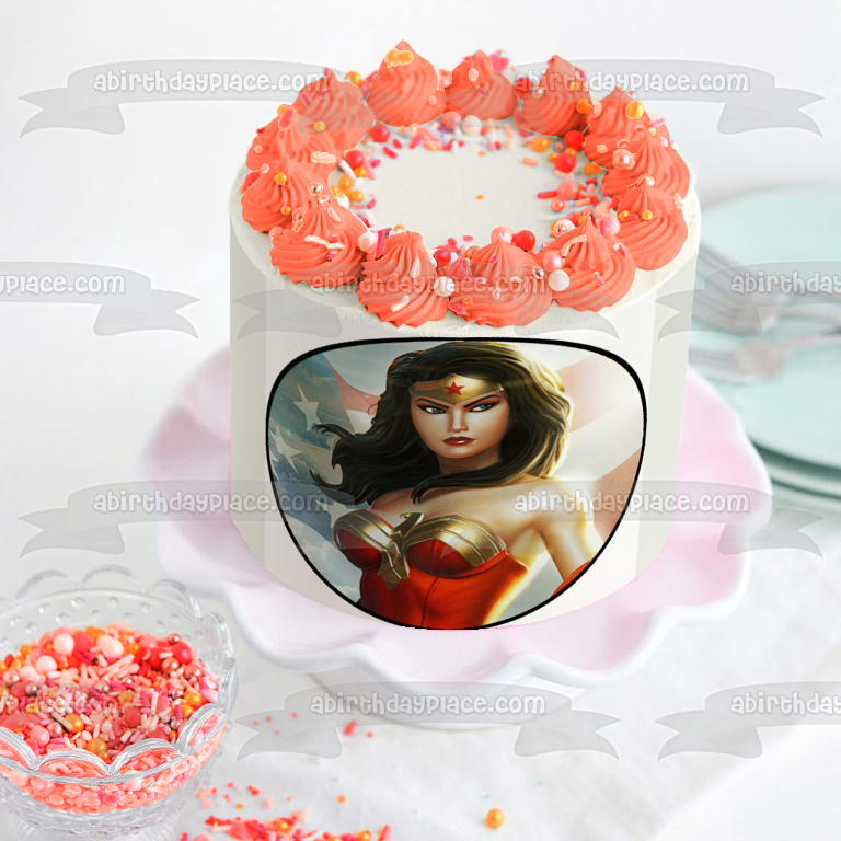 Decorate your Cake with this Justice League themed Edible Cake Topper Image featuring Wonder Woman and the American Flag Waving in the Background!
