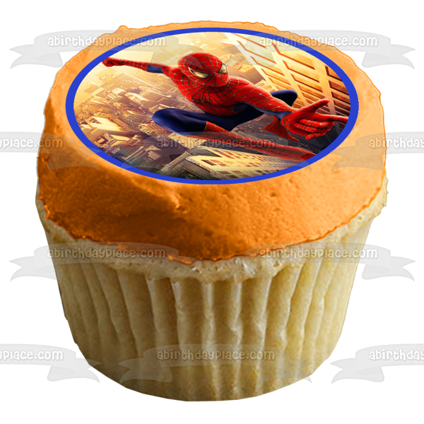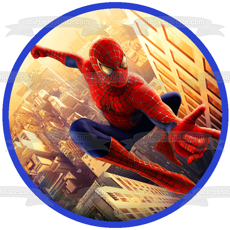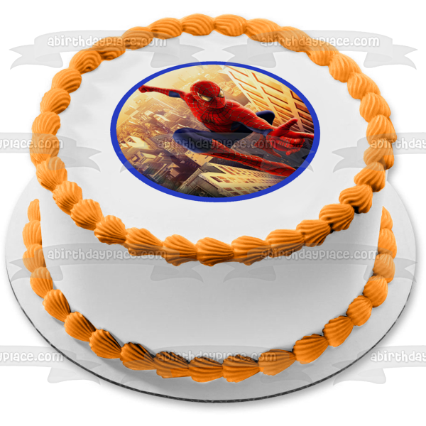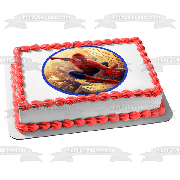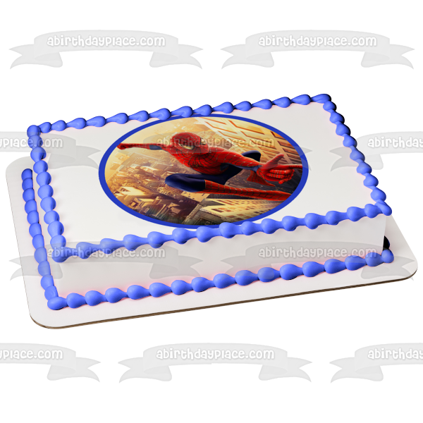 Decorate your Cake with this Marvel themed Edible Cake Topper Image featuring Spider-Man Jumping over Buildings!