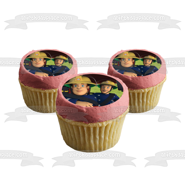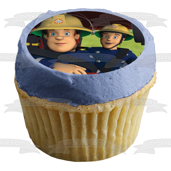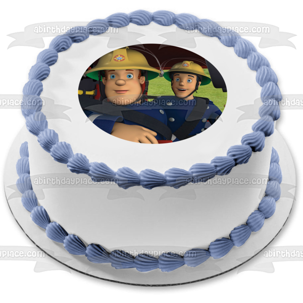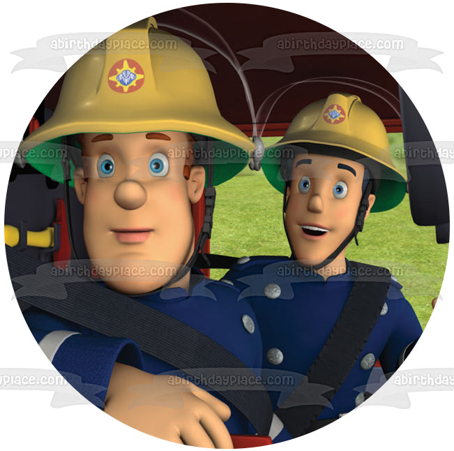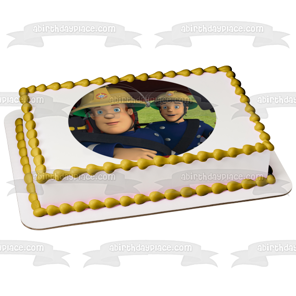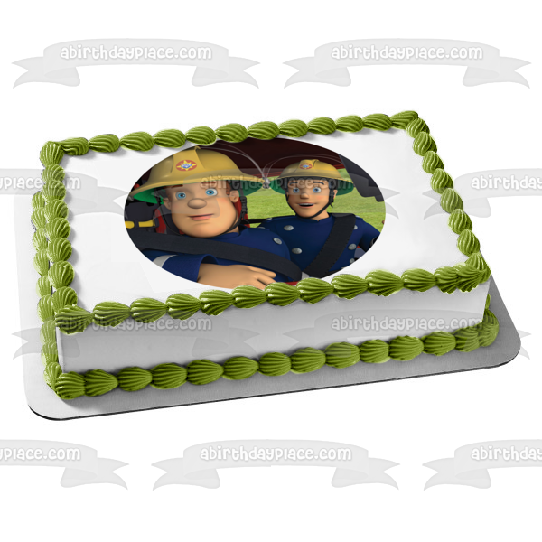 Decorate your Cake with this Fireman Sam themed Edible Cake Topper Image featuring him and his Co-Worker in a Fire Truck!