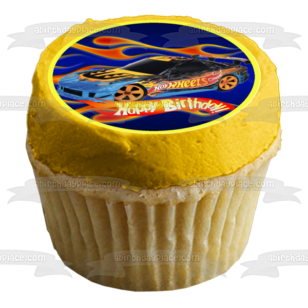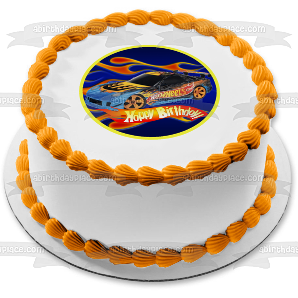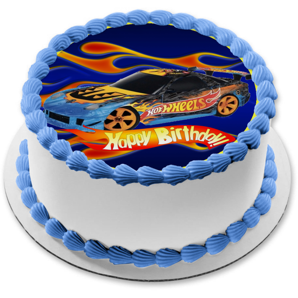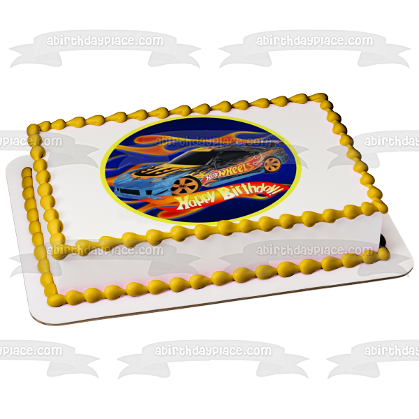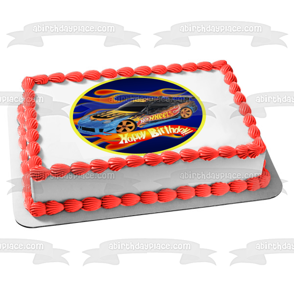 Decorate your Cake with this Hot Wheels Happy Birthday themed Edible Cake Topper Image featuring a Blue Race Car!