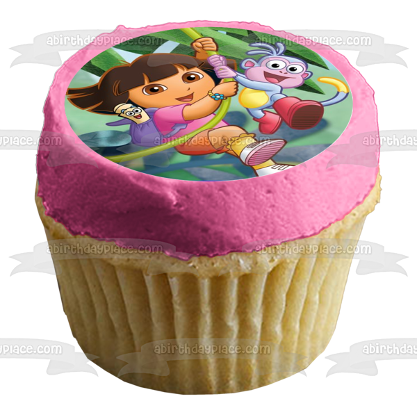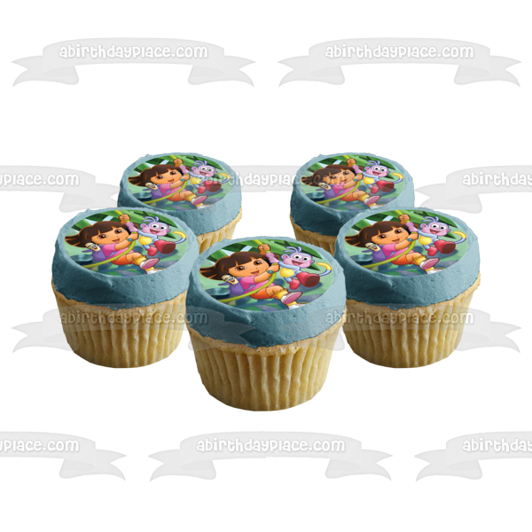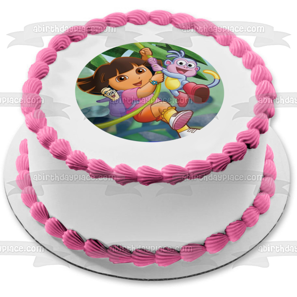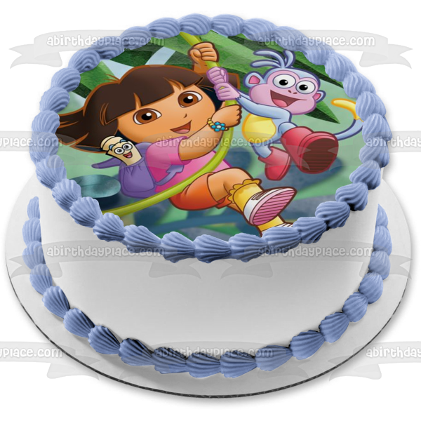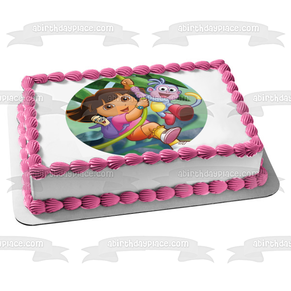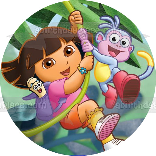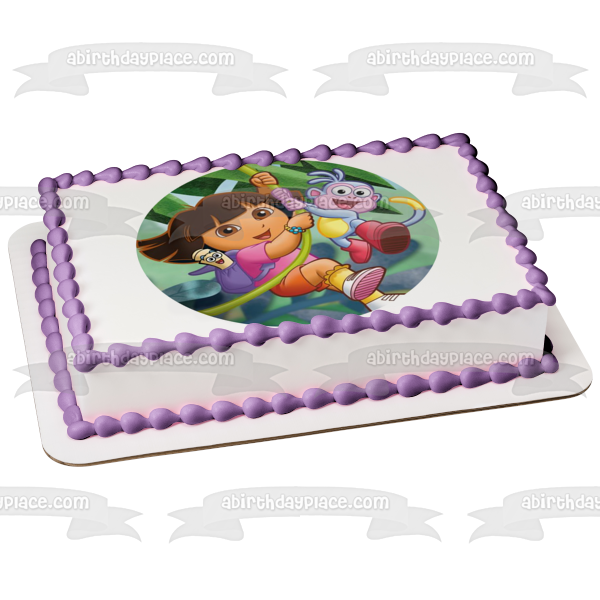 Decorate your Cake with this Dora the Explorer themed Edible Cake Topper Image featuring Dora, Map, Backpack and Boots Swinging on a Vine!