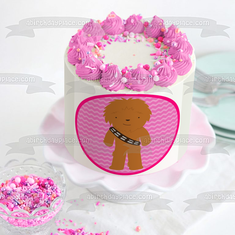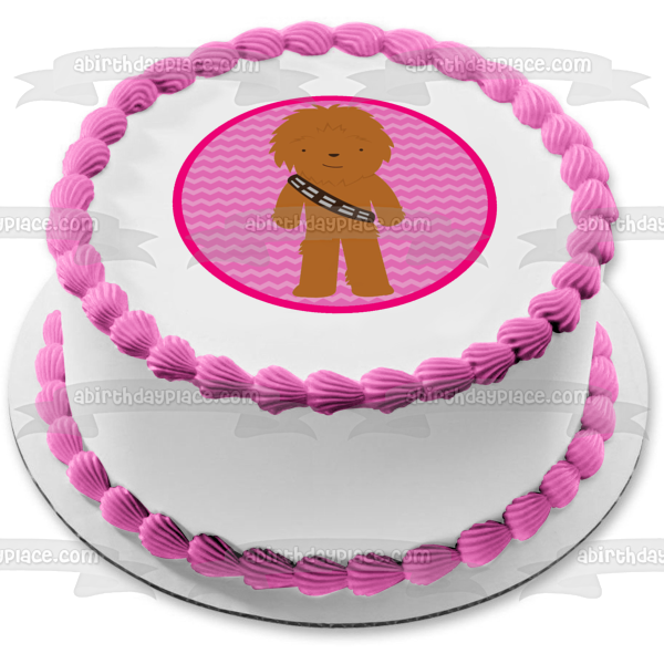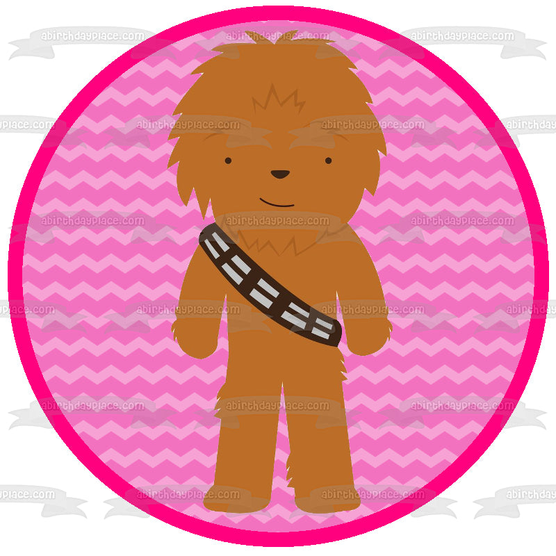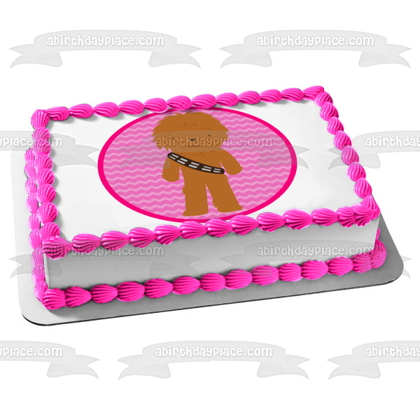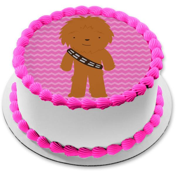 Decorate your Cake with this Star Wars themed Edible Cake Topper Image featuring a Cartoon Chewbaca and a Pink Background!