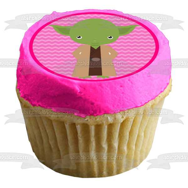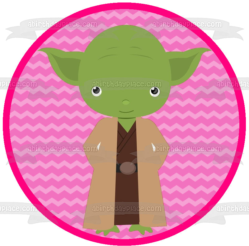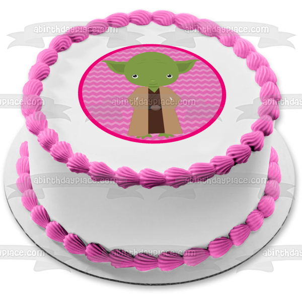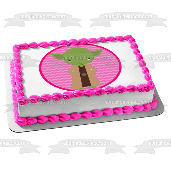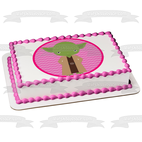 Decorate your Cake with this Star Wars themed Edible Cake Topper Image featuring a Cartoon Yoda and a Pink Background!