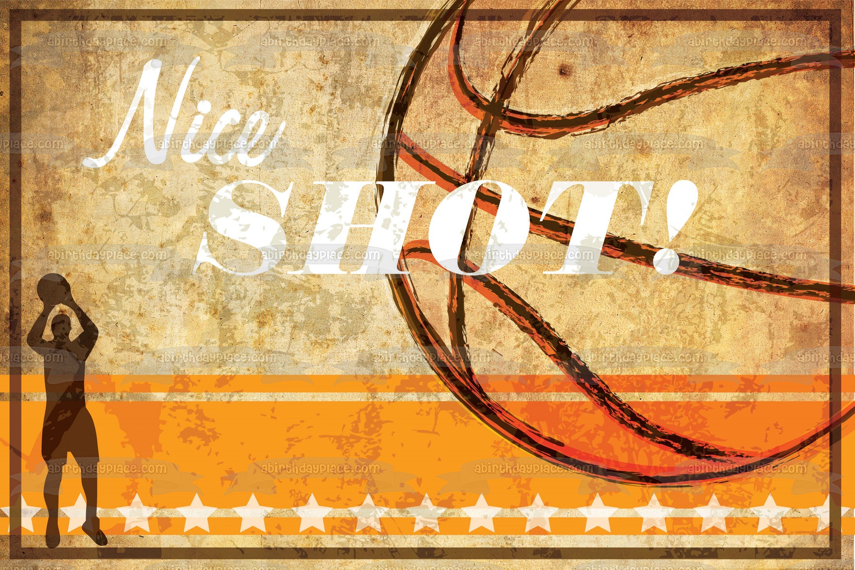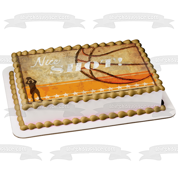 Decorate your Cake with this Sports themed Edible Cake Topper Image featuring a Basketball and a guy Shooting a Basketball behind the words "Nice Shot!"