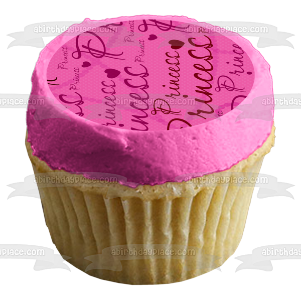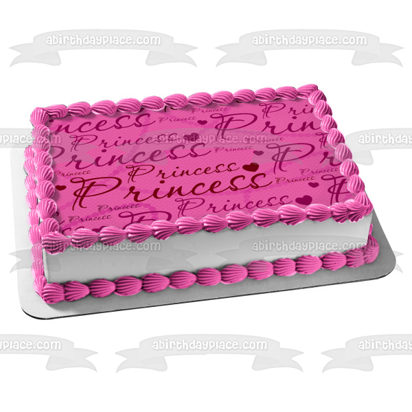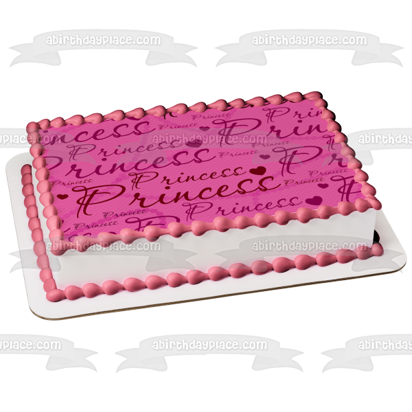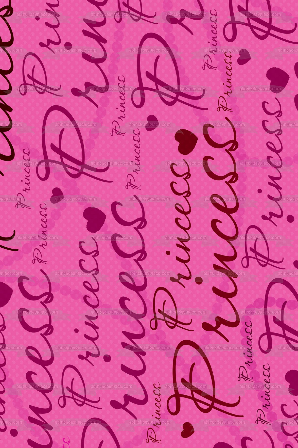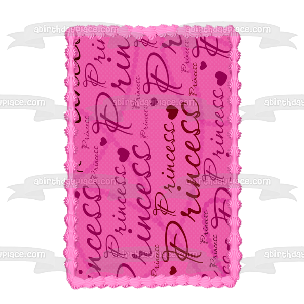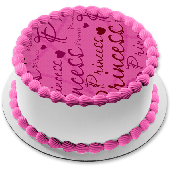 Decorate your Cake with this Pink themed Edible Cake Topper Image featuring the word "Princess" on a Pink Polka Dot Background with Hearts!