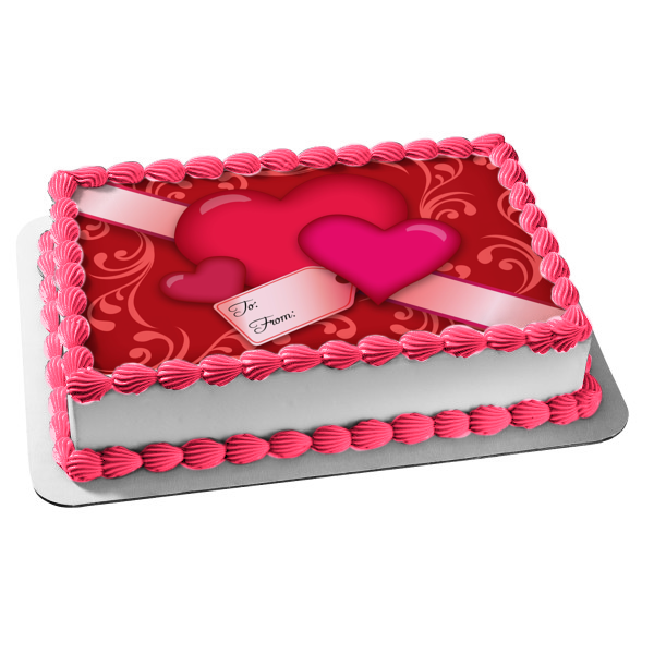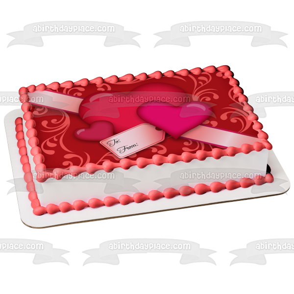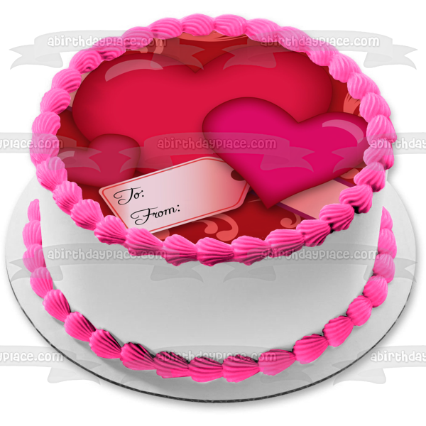 Decorate your Cake with this Valentines Day themed Edible Cake Topper Image featuring a Happy Valentines Day Gift Box with Hearts and a Label!
