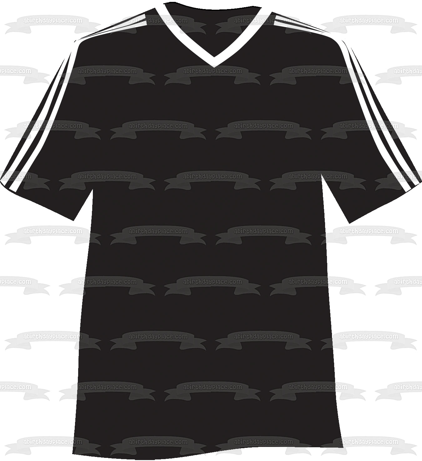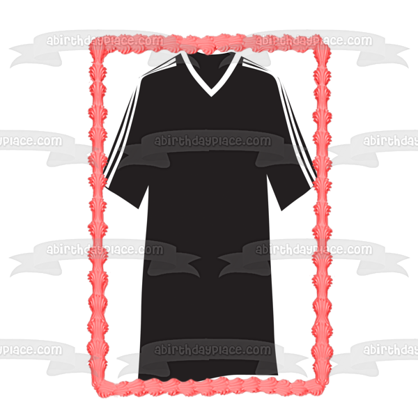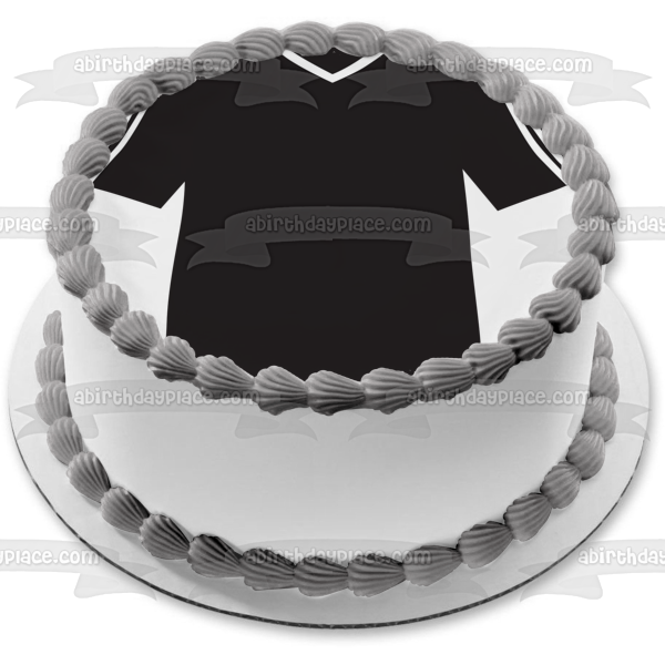 Decorate your Cake with this Sports themed Edible Cake Topper Image featuring a Black and White Soccer Jersey!