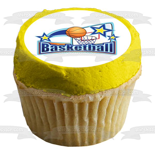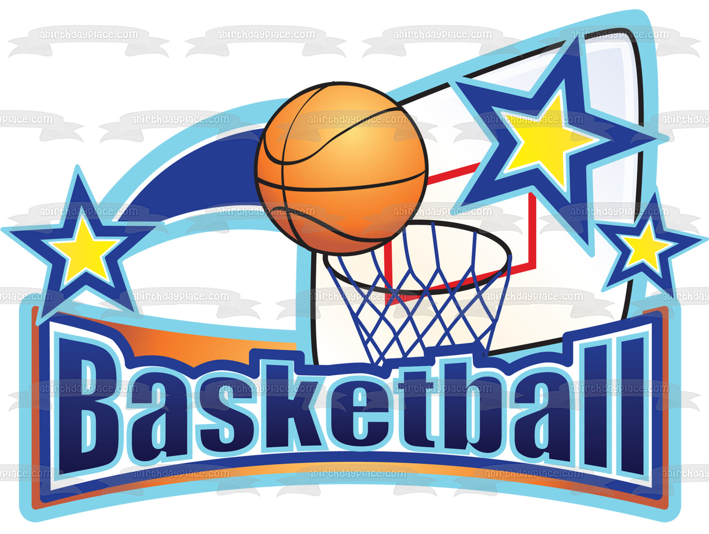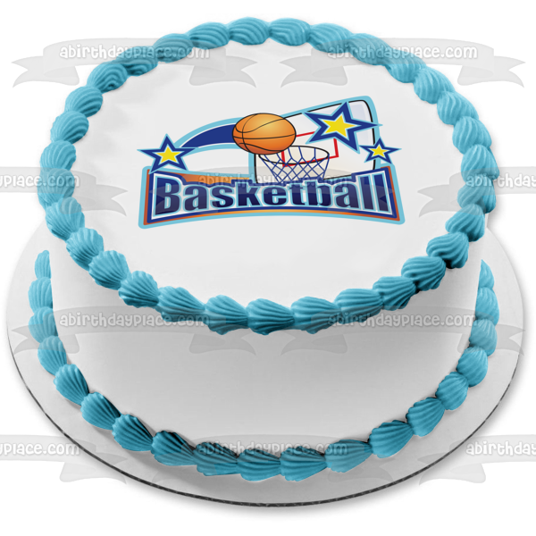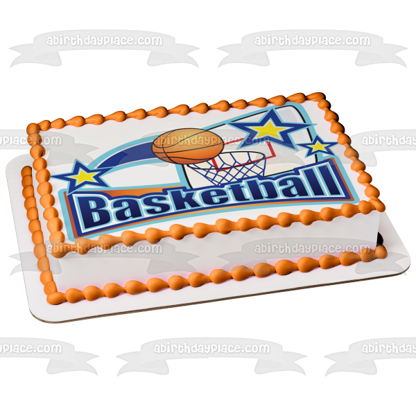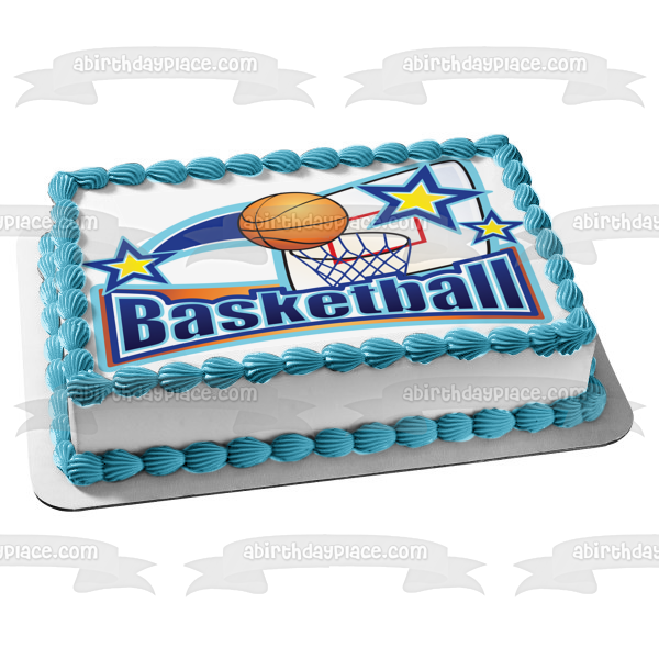Decorate your Cake with this Sports themed Edible Cake Topper Image featuring a Basketball going into a Hoop with Yellow Stars around the Backboard