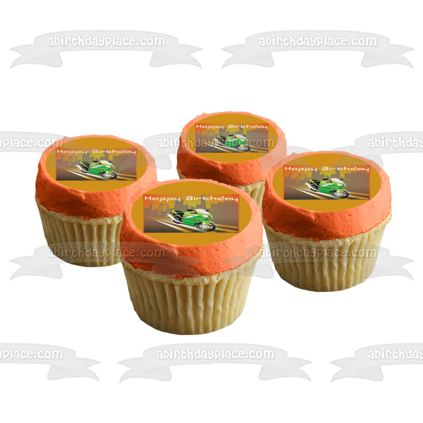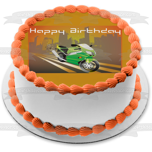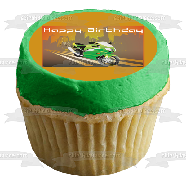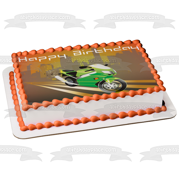 Decorate your Cake with this Happy Birthday themed Edible Cake Topper Image featuring a Green Motorcycle!