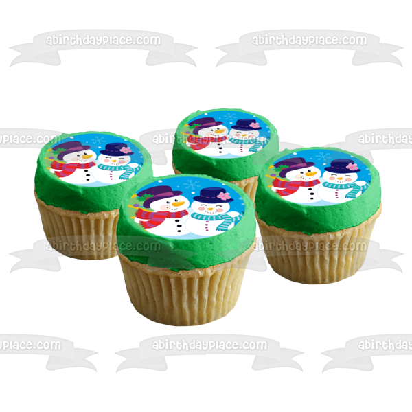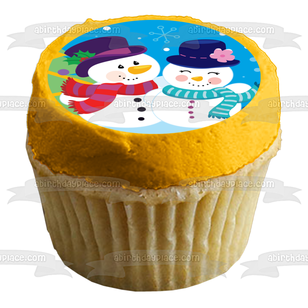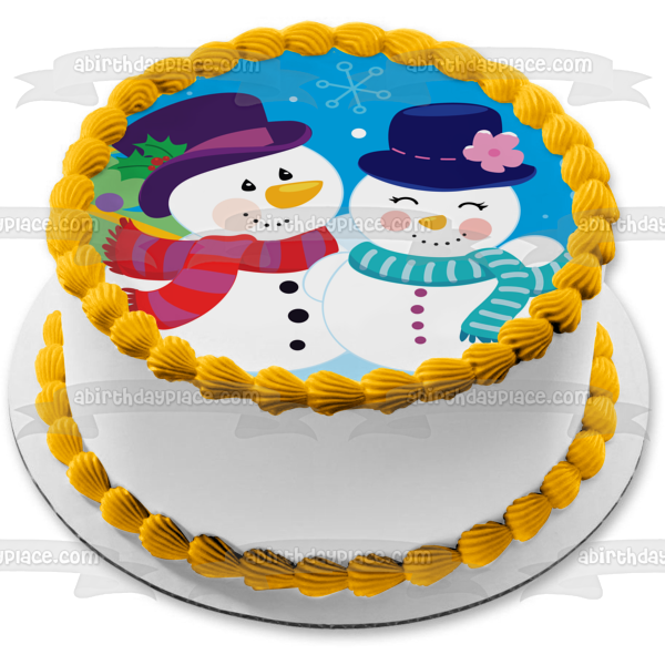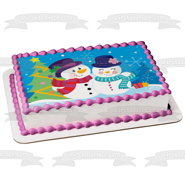 Decorate your Cake with this Merry Christmas themed Edible Cake Topper Image featuring a Snowman, Snowwoman, Presents and a Christmas Tree!