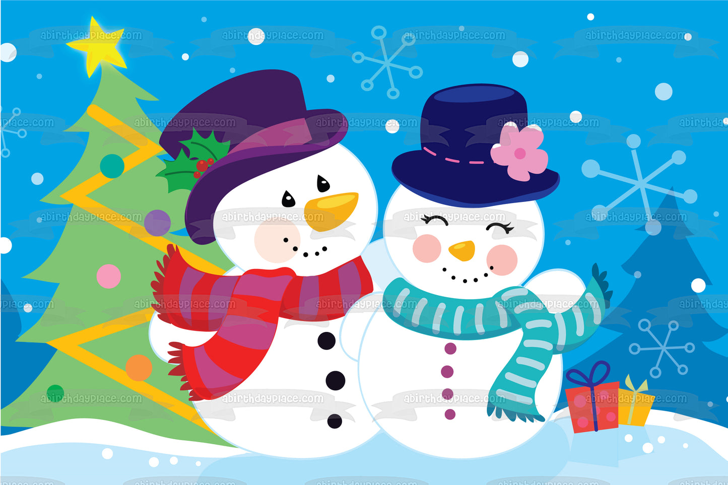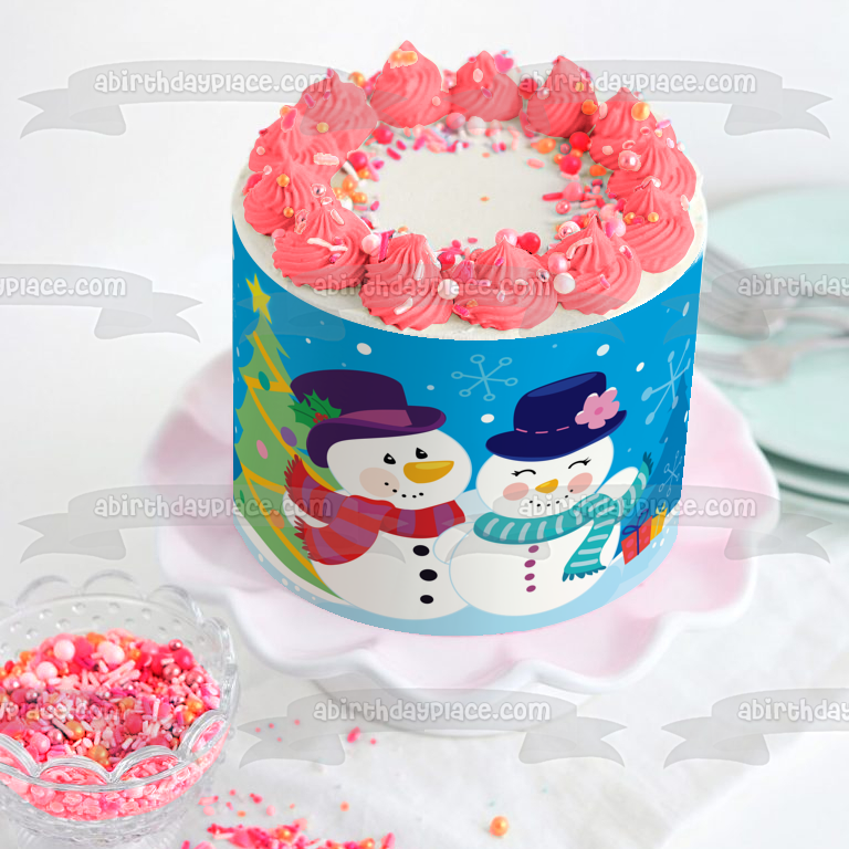 Merry Christmas Snowman and Snowwoman Christmas Tree Presents Edible Cake Topper Image ABPID13170