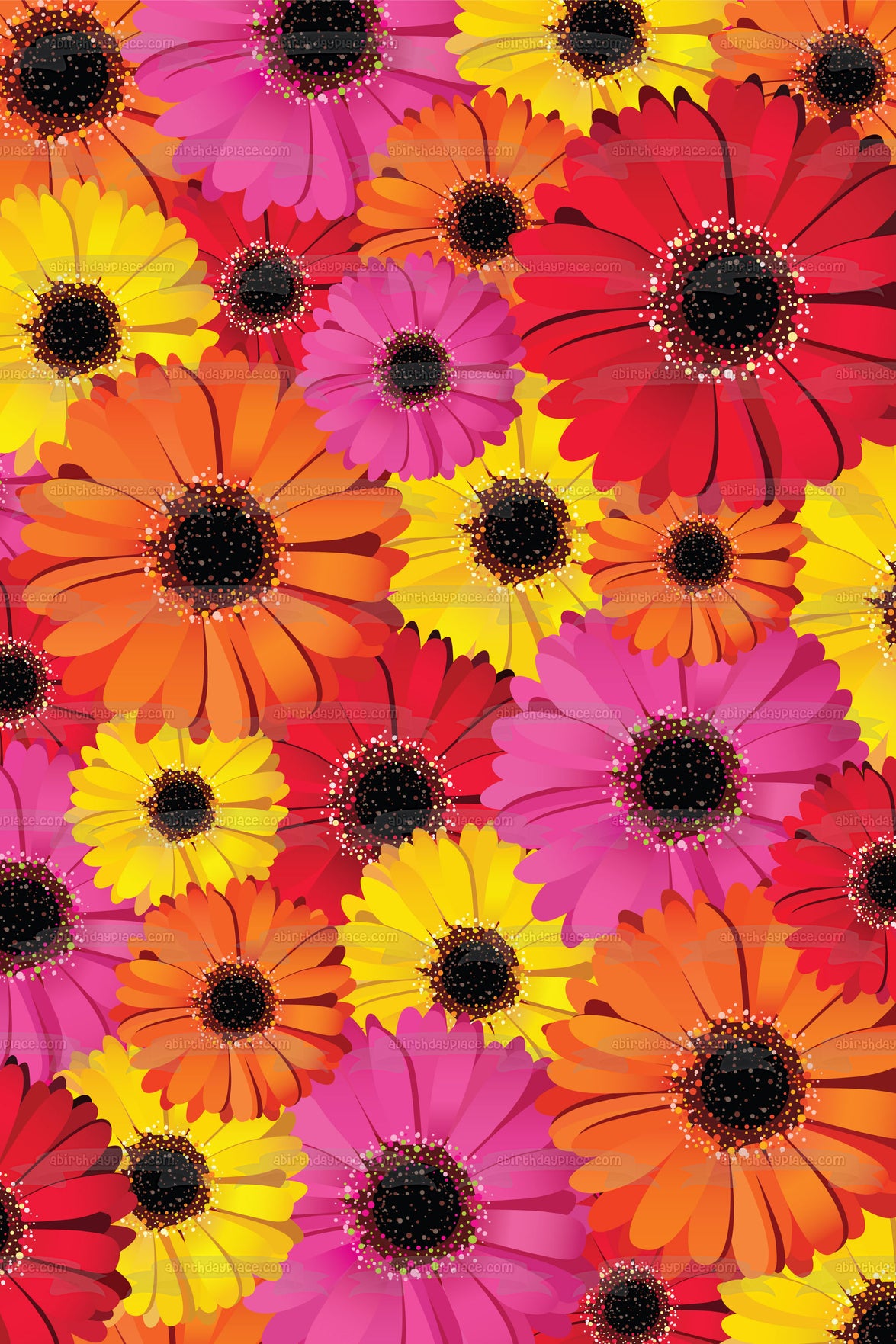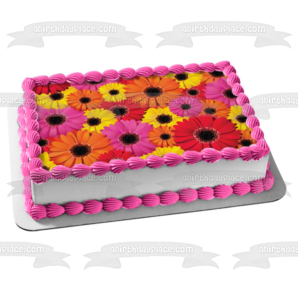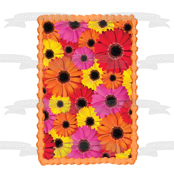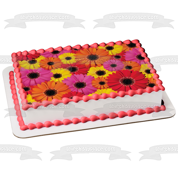 Decorate your Cake with this Flowers Pattern themed Edible Cake Topper Image featuring Red, Pink, Orange and Yellow Flowers with Sparkle Centers!